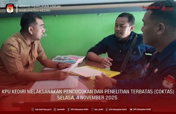 Kediri, kab-kediri.kpu.go.id - Selasa (4/11), KPU Kabupaten Kediri terus memperkuat validitas serta akurasi Data Pemilih melalui pelaksanaan Pencocokan dan Penelitian Terbatas atau COKTAS dalam rangka Pemutakhiran Data Pemilih Berkelanjutan (PDPB).