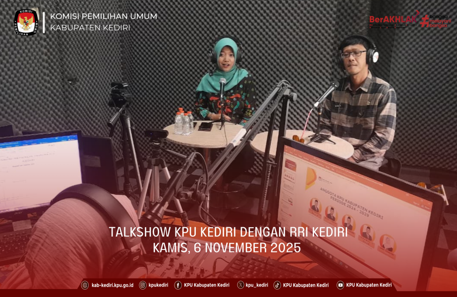 Kediri, kab-kediri.kpu.go.id - Kamis (6/11), Komisi Pemilihan Umum (KPU) Kabupaten Kediri kembali hadir dalam program Talkshow RRI Kediri dengan tema “Mengenal Divisi Hukum dan Pengawasan KPU Kabupaten Kediri.”