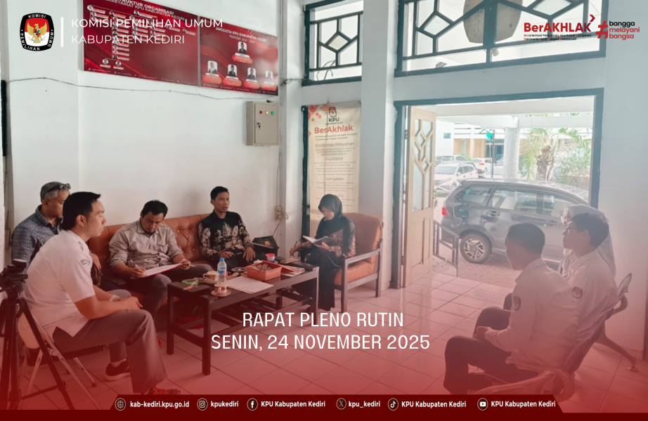 Kediri, kab-kediri.kpu.go.id - Senin (24/11), Komisi Pemilihan Umum (KPU) Kabupaten Kediri melaksanakan Rapat Pleno Rutin mingguan yang berlangsung di Kantor KPU Kabupaten Kediri.