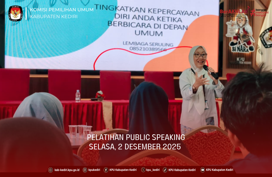 Kediri, kab-kediri.kpu.go.id - Selasa (2/12), KPU Kabupaten Kediri menggelar kegiatan Pelatihan Public Speaking yang diikuti oleh seluruh pegawai sekretariat KPU Kabupaten Kediri. Kegiatan ini berlangsung di Aula Kantor KPU Kabupaten Kediri dan menjadi bagian dari peningkatan kapasitas SDM, khususnya dalam hal komunikasi, penyampaian informasi, dan keterampilan berbicara di depan publik.