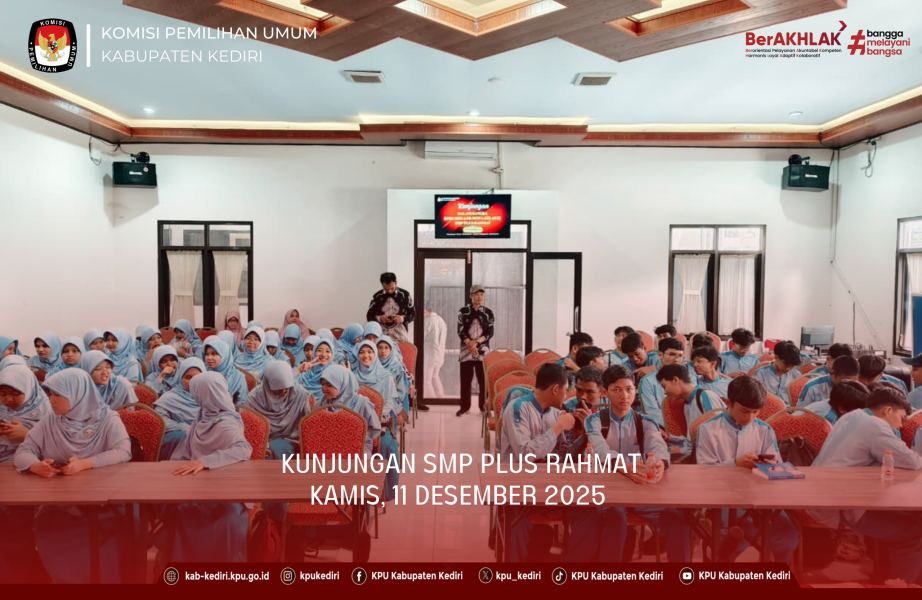 Kediri, kab-kediri.kpu.go.id - Kamis (11/12), KPU Kabupaten Kediri menerima kunjungan edukatif dari para pelajar SMP Plus Rahmat, yang bertempat di Aula KPU Kabupaten Kediri pukul 07.30 – selesai.