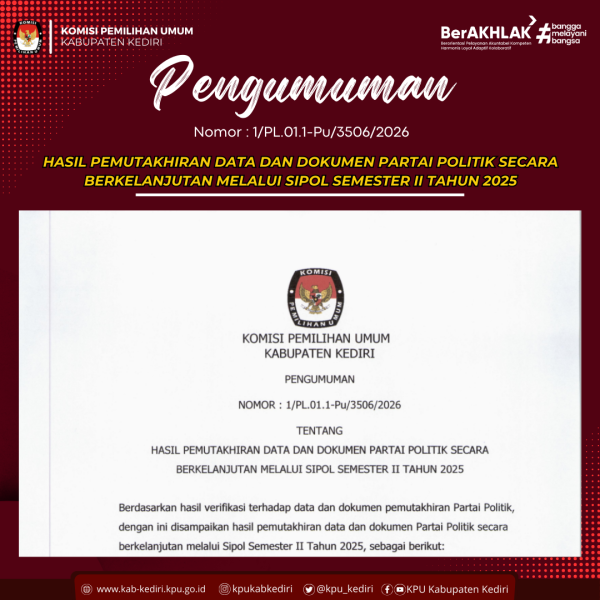 Pengumuman Nomor: 1/PL.01.1-Pu/3506/2026 Tentang Hasil Pemutakhiran Data dan Dokumen Partai Politik secara Berkelanjutan Melalui SIPOL Semester II Tahun 2025......KLIK DISINI