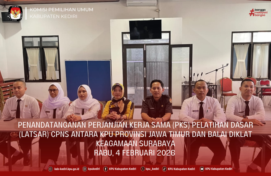 Kediri, kab-kediri.kpu.go.id - KPU Kabupaten Kediri mengikuti kegiatan Penandatanganan Perjanjian Kerja Sama (PKS) antara KPU Provinsi Jawa Timur dan Balai Diklat Keagamaan (BDK) Surabaya terkait pelaksanaan Pelatihan Dasar (Latsar) CPNS KPU Provinsi Jawa Timur. Kegiatan yang dilaksanakan di BDK Surabaya ini diikuti pula secara daring oleh seluruh satker KPU Kabupaten/Kota se-Jawa Timur, dengan peserta terdiri atas Ketua Divisi Sosdiklih Parmas dan SDM, Kasubbag Parhubmas dan SDM, serta seluruh CPNS.