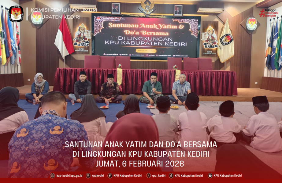 Kediri, kab-kediri.kpu.go.id - Jumat (6/2), KPU Kabupaten Kediri menggelar kegiatan santunan anak yatim dan doa bersama sebagai wujud kepedulian terhadap generasi bangsa, sekaligus untuk mempererat tali silaturahmi dan meningkatkan solidaritas antar sesama.