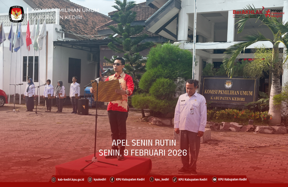 Kediri, kab-kediri.kpu.go.id - Senin (9/2), KPU Kabupaten Kediri melaksanakan apel pagi rutin yang diikuti oleh Pimpinan serta seluruh jajaran Sekretariat. Kegiatan berlangsung mulai pukul 08.00 WIB dan berjalan tertib hingga selesai.