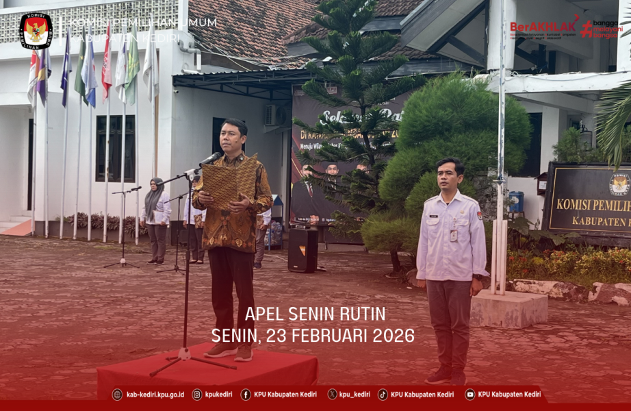 Kediri, kab-kediri.kpu.go.id - Senin (23/2), KPU Kabupaten Kediri melaksanakan apel pagi rutin yang diikuti oleh Pimpinan serta seluruh jajaran Sekretariat. Kegiatan berlangsung mulai pukul 08.00 WIB dan berjalan tertib hingga selesai.
