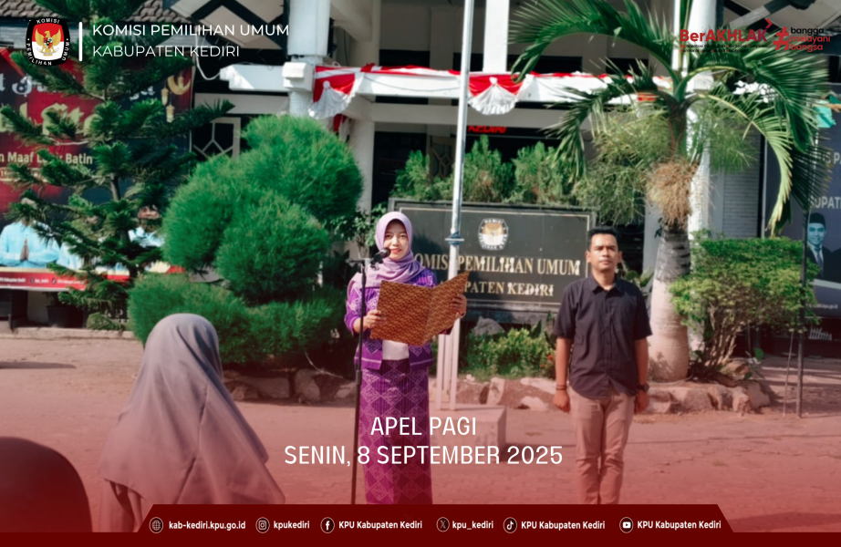 Kediri, kab-kediri.kpu.go.id - Senin (08/09), KPU Kabupaten Kediri menggelar apel pagi rutin yang dilaksanakan setiap hari Senin dan diikuti oleh seluruh jajaran Sekretariat KPU Kabupaten Kediri. Kegiatan dimulai pukul 08.00 WIB dan berlangsung tertib hingga selesai.