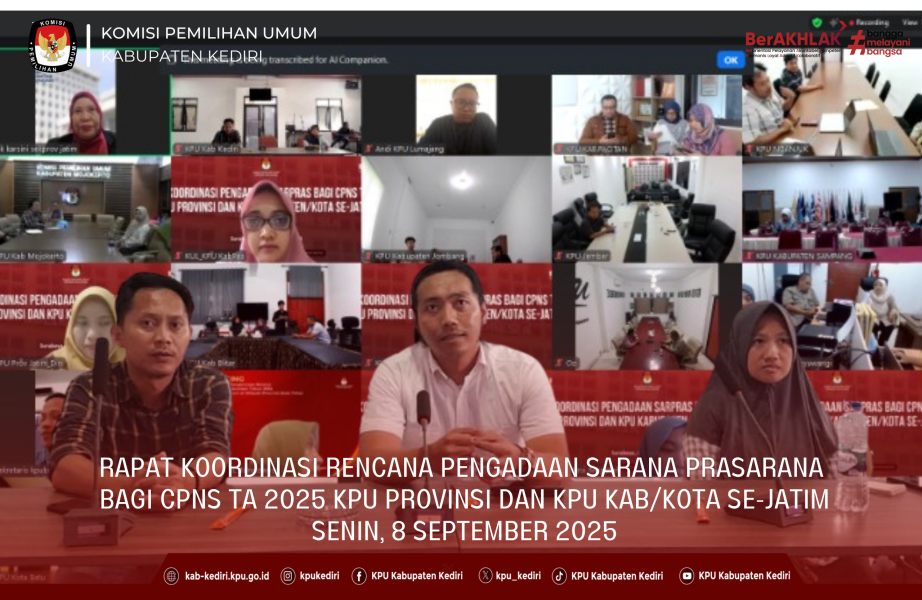 Kediri, kab-kediri.kpu.go.id - Senin (25/08), KPU Kabupaten Kediri menghadiri Rapat Koordinasi Rencana Pengadaan Sarana dan Prasarana bagi Calon Pegawai Negeri Sipil (CPNS) Tahun Anggaran 2025 yang diselenggarakan Komisi Pemilihan Umum (KPU) Provinsi Jawa Timur. Kegiatan ini diikuti oleh Sekretaris, Kasubbag Keuangan, Umum dan Logistik, Pejabat Pembuat Komitmen (PPKOM) KPU kabupaten/kota se-Jawa Timur secara daring dan dipimpin langsung oleh Sekretaris KPU Provinsi Jawa Timur, Nanik Karsini.