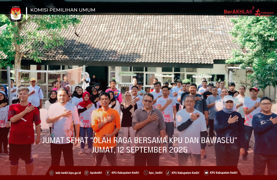 Kediri, kab-kediri.kpu.go.id - Jumat (12/09) KPU Kabupaten Kediri turut serta dalam kegiatan Jumat Sehat olahraga bersama yang diselenggarakan di Kantor KPU Kota Kediri. Kegiatan ini diikuti oleh jajaran KPU Kabupaten Kediri, KPU Kota Kediri, Bawaslu Kabupaten Kediri, serta Bawaslu Kota Kediri.