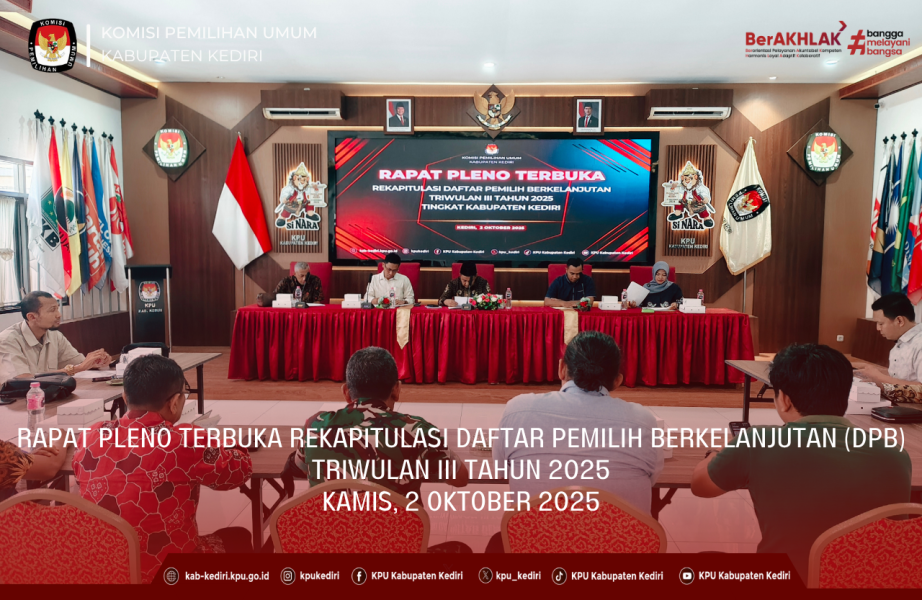 Kediri, kab-kediri.kpu.go.id - KPU Kabupaten Kediri kembali menggelar Rapat Pleno Terbuka Rekapitulasi Rekapitulasi Pemutakhiran Data Pemilih Berkelanjutan (PDPB)) Triwulan III Tahun 2025 bertempat di Aula KPU Kabupaten Kediri. Pleno dimulai pukul 09.00 WIB dan dihadiri oleh Komisioner KPU serta perwakilan dari beberapa instansi antara lain: Bawaslu Kediri, Polres Kediri, Polres Kediri Kota, Bakesbangpol Kediri, Dispendukcapil Kediri, dan Kodim 0809.
