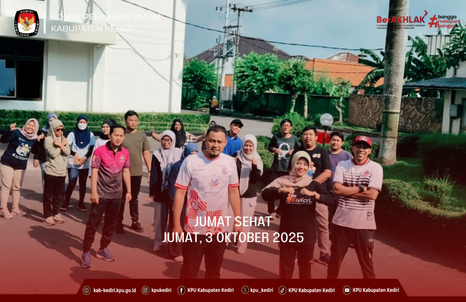 Kediri, kab-kediri.kpu.go.id - Jumat (3/10), pukul 07.30 WIB, KPU Kabupaten Kediri menggelar kegiatan Jumat Sehat sebagai bagian dari upaya menjaga kebugaran tubuh, meningkatkan kesehatan jasmani, serta mempererat kebersamaan dan kekompakan antar pegawai di lingkungan KPU Kabupaten Kediri.