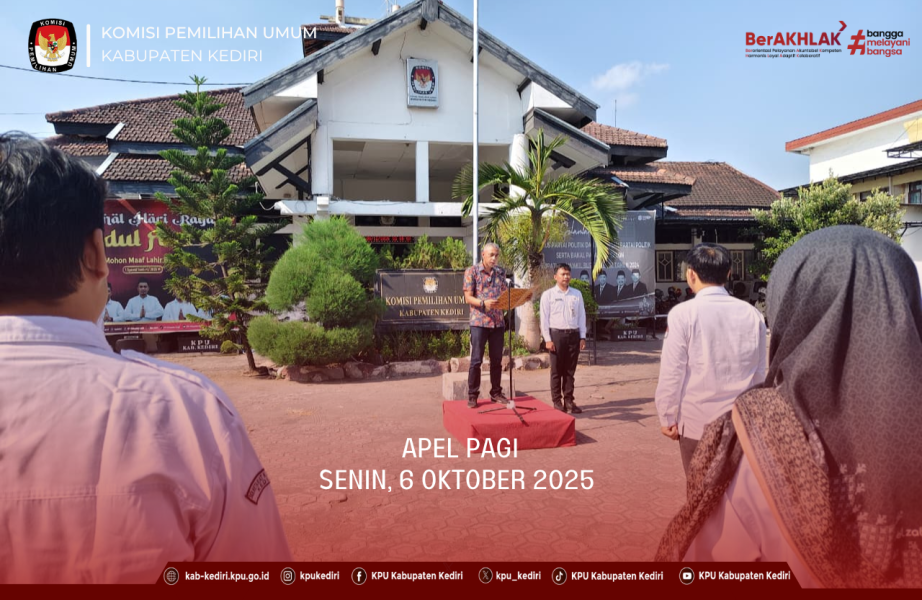 Kediri, kab-kediri.kpu.go.id - Senin (06/10), KPU Kabupaten Kediri menggelar apel pagi rutin yang dilaksanakan setiap hari Senin dan diikuti oleh seluruh jajaran Sekretariat KPU Kabupaten Kediri. Kegiatan dimulai pukul 08.00 WIB dan berlangsung tertib hingga selesai.