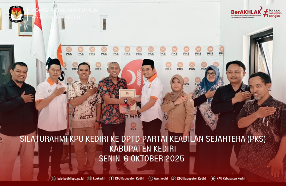 Pada kesempatan ini, KPU Kabupaten Kediri berkunjung ke kantor DPTD Partai Keadilan Sejahtera (PKS) Kabupaten Kediri. Kegiatan dihadiri oleh Anggota, serta Kasubbag Teknis dan Hukum dan Kasubbag Parmas dan SDM KPU Kabupaten Kediri. Dari pihak PKS, hadir Ketua DPD beserta jajaran pengurus harian.