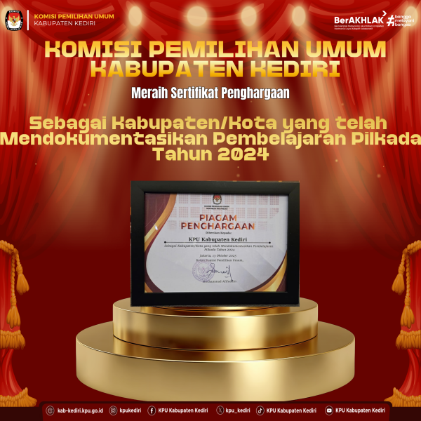 Kediri, kab-kediri.kpu.go.id - Komisi Pemilihan Umum (KPU) Kabupaten Kediri kembali menorehkan prestasi membanggakan. Kali ini, KPU Kabupaten Kediri menerima piagam penghargaan dari KPU Republik Indonesia sebagai salah satu kabupaten/kota yang telah mendokumentasikan pembelajaran Pilkada Tahun 2024 dengan baik.