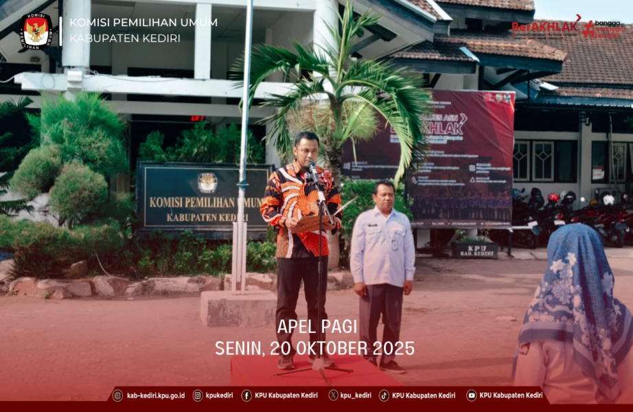 Kediri, kab-kediri.kpu.go.id - Senin (20/10), KPU Kabupaten Kediri menggelar apel pagi rutin yang dilaksanakan setiap hari Senin dan diikuti oleh seluruh jajaran Sekretariat KPU Kabupaten Kediri. Kegiatan dimulai pukul 08.00 WIB dan berlangsung tertib hingga selesai.