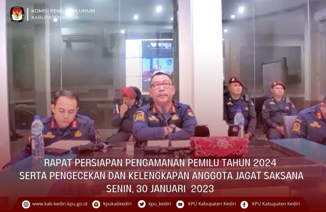 Kediri, kab-kediri.kpu.go.id - Senin (30/1/2023) Komisi Pemilihan Umum (KPU) Kabupaten Kediri mengikuti Rapat Persiapan Pengamanan Pemilu Tahun 2024 serta Pengecekan dan Kelengkapan Anggota Jagat Saksana, yang digelar KPU RI. Berlangsung kurang lebih selama tiga jam, rapat dimulai pukul 09.00 – 12.00 WIB.