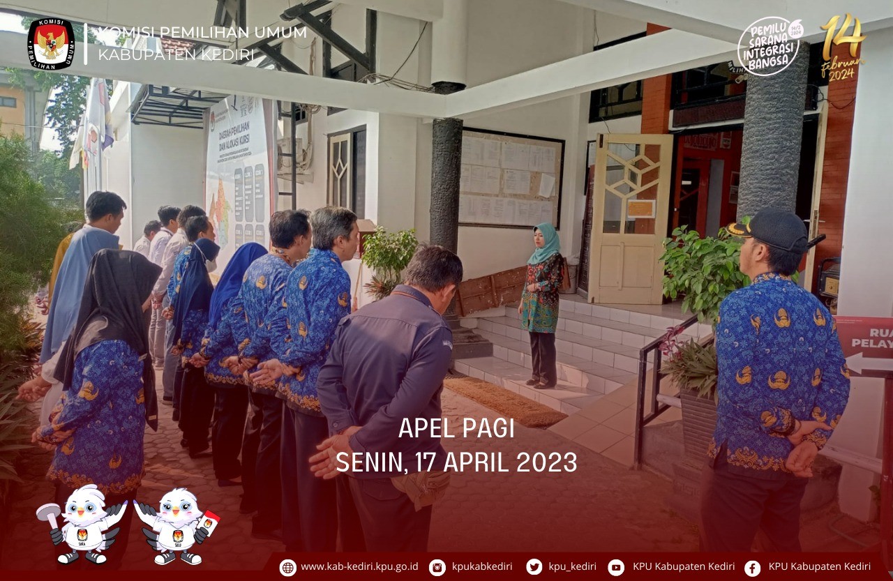 Kediri, kab-kediri.kpu.go.id – Senin (17/4/2023) KPU Kabupaten Kediri menggelar apel pagi di halaman kantor KPU Jl.Pamenang No.1, Katang, Ngasem, Kediri.