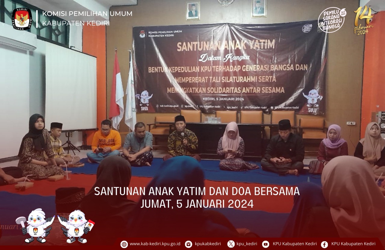 Kediri, kab-kediri.kpu.go.id - Jumat (5/1) KPU Kabupaten Kediri menggelar santunan anak yatim dalam rangka bentuk kepedulian KPU terhadap generasi bangsa dan mempererat tali silaturahmi serta meningkatkan solidaritas antar sesama .