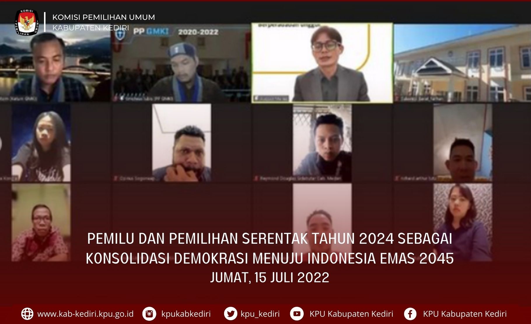 Kediri, kab-kediri.kpu.go.id - Jumat (15/7/2022) Komisi Pemilihan Umum (KPU) Kabupaten Kediri mengikuti Webinar Nasional Gerakan Mahasiswa Kristen Indonesia (GMKI), "Pemilu dan Pemilihan Serentak Tahun 2024 Sebagai Konsolidasi Demokrasi Menuju Indonesia Emas 2045". Hadir sebagai narasumber Anggota KPU RI August Mellaz dan Ketua GMKI Jefri Gultom.
