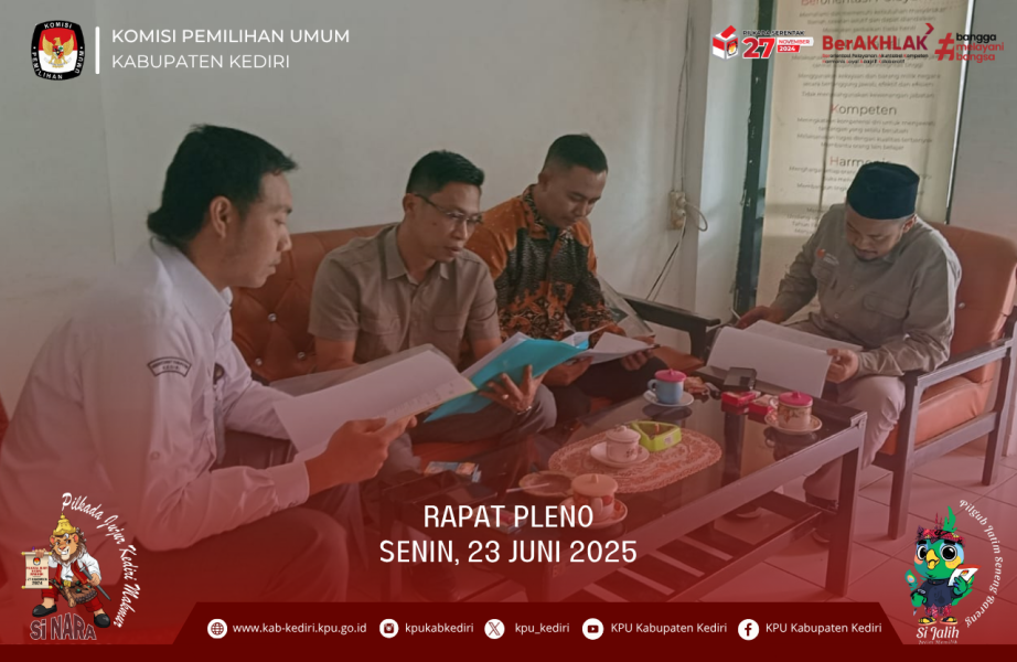 Kediri, kab-kediri.kpu.go.id - Senin (23/6), para pimpinan KPU Kabupaten Kediri menggelar rapat pleno rutin mingguan yang bertujuan untuk mengevaluasi kinerja selama satu minggu ke belakang serta membahas hal-hal penting dan strategis untuk satu minggu ke depan.