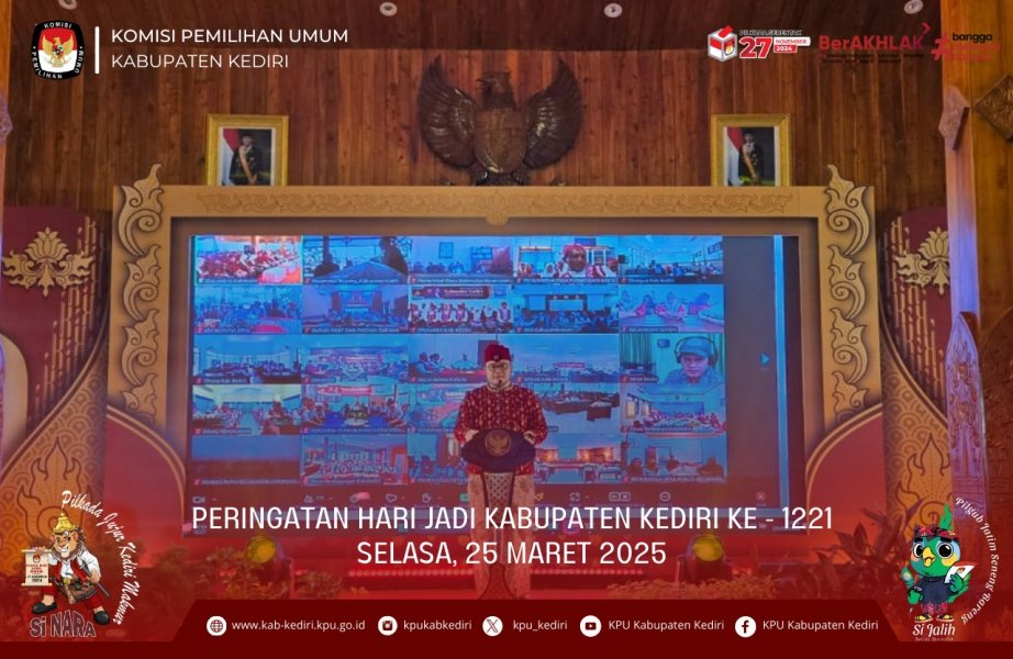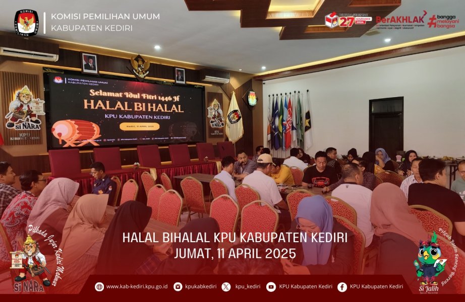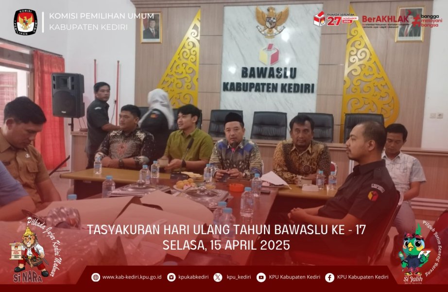 Kediri, kab-kediri.kpu.go.id - Selasa (15/4), KPU Kabupaten Kediri menghadiri Tasyakuran HUT Bawaslu RI ke-17 dilaksanakan oleh Bawaslu Kabupaten Kediri Acara digelar di Aula Bawaslu Kabupaten Kediri dengan dihadiri Ketua dan Anggota KPU Kabupaten Kediri beserta Sekretaris, dan Undangan Lainnya. Diawali dengan sambutan dari Ketua Bawaslu Kabupaten Kediri Saifudin Zuhri yang menyampaikan terimakasih telah menghadiri acara pada siang hari ini dan berharap semoga kedepan Bawaslu dapat terus berkontribusi dalam mengawal demokrasi di Indonesia. "Terimakasih kepada seluruh yang hadoir pada acara tasyakuran hari ini," Ucap Saifudin. Pada kesempatan ini Ketua KPU Kabupaten Kediri Nanang Qosim juga memberikan apresisai kepada Bawaslu yang senantiasa membersamai dan bersinergi dengan KPU. "Terimakasih telah bekerja sama serta bersinergi dengan KPU," ucap nanang kosim Tasyakuran dilaksanakan dengan sederhana dan dilanjutkan dengan potong tumpeng dan doa bersama.(and)