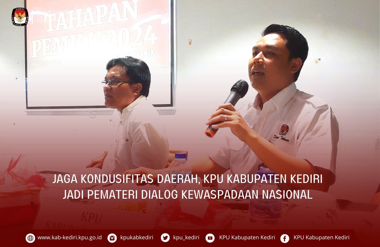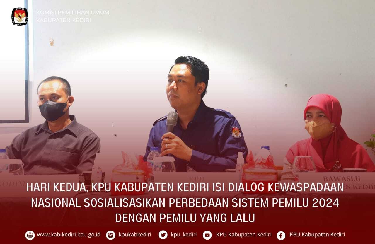 Kediri, kab-kediri.kpu.go.id – Selasa (25/10/2022) Komisi Pemilihan Umum (KPU) Kabupaten Kediri kembali isi materi pada giat Dialog Kewaspadaan Nasional (Peran Elemen Masyarakat Dalam Menjaga Kondusifitas Daerah Menjelang Pilkades Serentak 2022 dan Pemilu 2024 di Kabupaten Kediri) yang dilaksanakan oleh Badan Kesatuann Bangsa dan Politik (Bakesbangpol) Kabupaten Kediri. Masih dengan undangan yang sama, pada hari kedua ini dihadiri oleh Pimpinan Bakesbangpol Kabupaten Kediri, Tokoh masyarakat (Kepala Dusun) yang kemarin belum hadir, mengingat kegiatan ini dilaksanakan empat hari karena jumlah Dusun Kecamatan se-Kabupaten Kediri yang cukup banyak. Adapun kegiatan hari ini pemateri diisi oleh Perwakilan Kodim 0809 Kediri, Letu Dwi Agus Harianto, Bawaslu Kabupaten Kediri Anik Ekowati, dan dari KPU Kabupaten Kediri oleh Agus Hariono. Dalam materinya, Agus membuka dengan tugas dan peranan KPU dalam Pemilu, khususnya Pemilu 2024, Ia juga menekankan bahwa Pilihan Kepala Desa (Pilkades) sebenarnya bukan ranah KPU. Kemudian ia melanjutkan dengan evaluasi, tantangan pemilu dan pilkada, hingga isu strategis yang akan terjadi di tahun 2023 berupa Kampanye Legistlatif. Agus juga mewanti – wanti Kasun untuk mengecek namanya apakah tercatut dalam partai politik dengan menggunakan SIPOL dan bisa mengajukan tanggapan masyarakat “Kalau kemarin masuk ke data SIPOL maka tahun ini masih masuk,” ujarnya. Pada dialog interaktif yang dilakukan, Agus menjelaskan evaluasi sistem pelaksanaan Pemilu 2019 dan perbedaannya dari Pemilu yang akan datang, diantaranya ; penambahan TPS yang dulu hanya 5555 sekarang menjadi 5758, penghitungan dan pemungutan suara yang dilaksanakan 2 hari, menyederhanakan surat suara, penghitungan dengan sistem panel, hingga menggunakan aplikasi SIREKAB guna meminimalisir hal yang tidak diinginkan salah satunya beberapa Adhoc KPU yang meninggal atau sakit akibat kelelahan pada Pemilu 2019. Menanggapi pertanyaan dari Kasun Ringinpitu tentang tercatutnya nama orang yang sudah meninggal, Agus menekankan bahwa pelaksanaan tahapan pemilu 2024 berbeda dari tahun lalu, khususnya mengenai data pemilih. Ia menjelaskan bahwa Pasca Pilkada, KPU selalu melakukan pemutakhiran data berkelanjutan PPDB setiap bulan antara Badan Pusat Statistik (BPS), TNI Polri, hingga Dispendukcapil. (Adn/Humas)