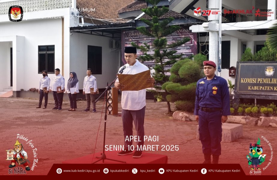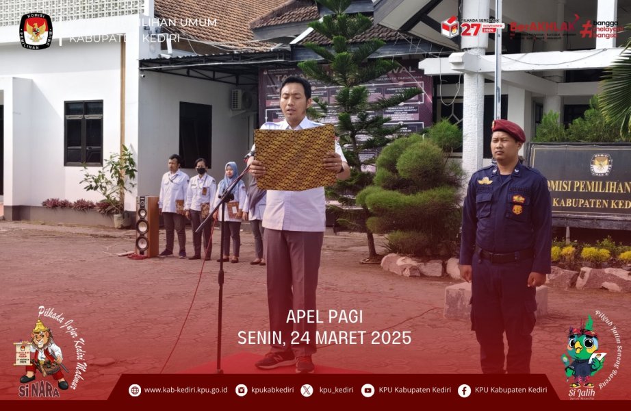 Kediri, kab-kediri.kpu.go.id - Senin (24/3), KPU Kabupaten Kediri menggelar Apel Pagi rutin setiap hari Senin yang diikuti oleh seluruh jajaran sekretariat KPU Kabupaten Kediri. Berlangsung mulai pukul 08.00 WIB sampai dengan selesai. Sesuai dengan teks susunan apel berjalan dengan lancar. Diawali dengan laporan kepada pembina apel dan dilanjut dengan penghormatan kepada bendera merah putih, kemudian mengheningkan cipta untuk mengenang jasa-jasa pahlawan bangsa Indonesia. Bertindak sebagai pembina Apel, R Randy Agatha Sakaira, selaku Sekretaris KPU Kabupaten kediri menyampaikan apresiasi kepada seluruh jajaran KPU Kabupaten Kediri yang masih mau dan mampu untuk melaksanakan apel pagi rutin setiap Senin pagi. "Terimakasih kepada kawan-kawan yang masih mau dan mampu untuk melaksanakan apel pagi rutin pada hari Senin di awal Bulan Ramadhan ini," ujar Randy. Lebih lanjut Randy juga menyampaikan bahwa dalam melaksanakan pekerjaan di bulan Ramadhan ini harus tetap produktif terlebih masih ada beberapa tanggungjawab yang harus diselesaikan sebelum memasuki masa cuti lebaran idul fitri. "Saya harap meskipun dalam suasana Ramadhan, teman-teman sekretariat harus tetap produktif karena masih ada pekerjaan yang harus kita selesaikan," terang Randy. Sebagai penutup amanat apel pagi ini Randy mengajak seluruh keluarga besar KPU Kabupaten Kediri untuk mengirim do'a kepada Almarhum Bapak WInarto selaku Kasubbag KUL yang baru saja berpulang. "Mari sebelum menutup apel pada pagi hari ini kita do'a kan teman-teman kita yang sedang sakit bisa segera berkumpul dengan kita lagi, dan juga kepada Pak Win yang sudah berpulang semoga amal ibadahnya diterima Allah SWT," tutup Randy.(and)