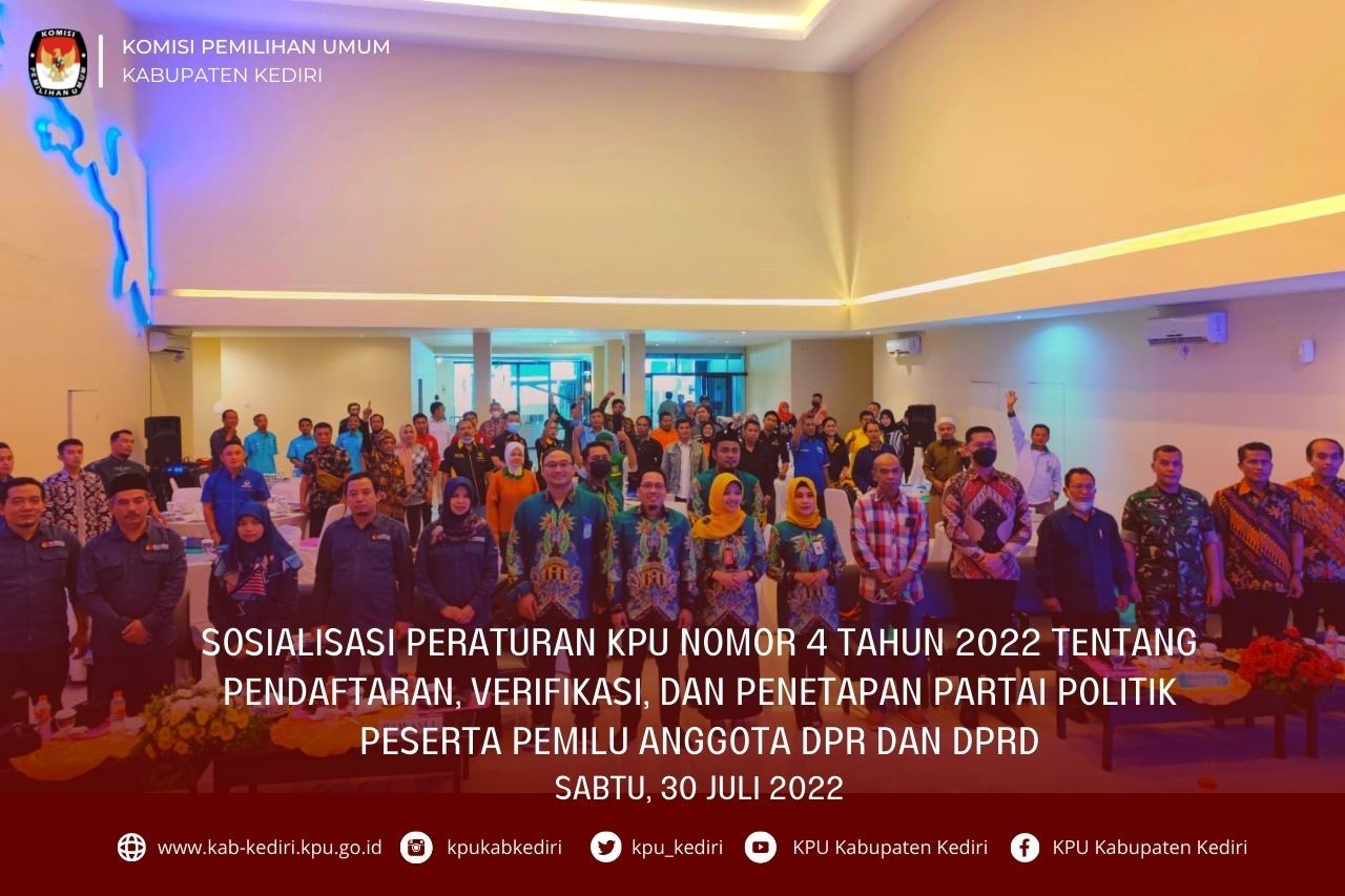 Kediri, kab-kediri.kpu.go.id – Sabtu (30/7/2022) KPU Kabupaten Kediri melakukan Sosialisasi PKPU Nomor 4 Tahun 2022 tentang Pendaftaran, Verifikasi, dan Penetapan Partai Politik Peserta Pemilu Anggota DPR dan DPRD. Sosialisasi tersebut digelar di Hotel Insumo Palace Kediri, dimulai pukul 10.00 WIB waktu setempat.