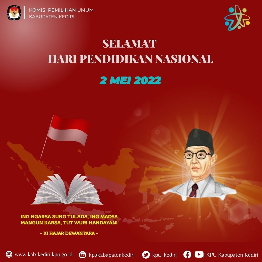 Kediri, kab-kediri.kpu.go.id - Setiap tanggal 2 Mei, kita selalu memperingati Hari Pendidikan Nasional yang bertepatan juga dengan tanggal lahir tokoh pahlawan nasional dikenal sebagai Bapak Pendidikan Nasional di Indonesia, Ki Hajar Dewantara. Ki Hajar Dewantara terkenal akan tiga semboyan dalam pendidikan yang sering kita jumpa yakni : “Ing Ngarsa Sung tuladha, Ing Madya Mangun Karsa, Tut Wuri Handayani” yang memiliki arti Di depan (guru) harus memberi contoh yang baik, ditengah-tengah (muridnya) harus menciptakan ide dan prakarsa, di belakang harus bisa memberi dorongan dan arahan. Dari filosofi semboyan tersebut, Ki Hajar Dewantara memberikan dorongan semangat kepada pribumi dan mendedikasikan sepanjang hidupnya memperjuangkan hak belajar kaum pribumi di masa penjajahan Belanda dengan membangun perguruan Taman Siswa, Yogyakarta. Namun, mengingat Hari Pendidikan Nasional 2022 yang jatuh bersamaan dengan Hari Raya Idul Fitri 1443 H, maka Kementerian Pendidikan, Kebudayaan, Riset, dan Teknologi (Kemendikbud Ristek) akan menyelenggarakan Upacara Bendera Peringatan Hari Pendidikan Nasional Tahun 2022 pada tanggal 13 Mei 2022 pukul 08.00 WIB secara tatap muka, terbatas, minimalis, dan menerapkan protokol kesehatan dalam upaya pencegahan penyebaran Covid-19 yang telah ditetapkan pemerintah tanpa mengurangi makna, semangat, dan kekhidmatan acara. Tema yang diusung pada Hari Pendidikan Nasional Tahun 2022 ini adalah “Pimpin Pemulihan, Bergerak untuk Merdeka Belajar”. Pandemi Covid-19 yang melanda seluruh dunia lebih dari dua tahun ini membawa dampak yang cukup signifikan terhadap dunia pendidikan, khususnya di Indonesia. Maka dari itu pada momen Hari Pendidikan Nasional ini mari kita merefleksikan diri untuk bisa bangkit dari keterpurukan dan bergerak bersama untuk mewujudkan visi pendidikan Indonesia. (pnj)