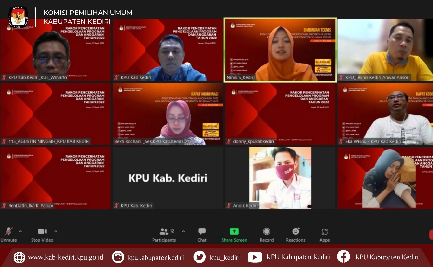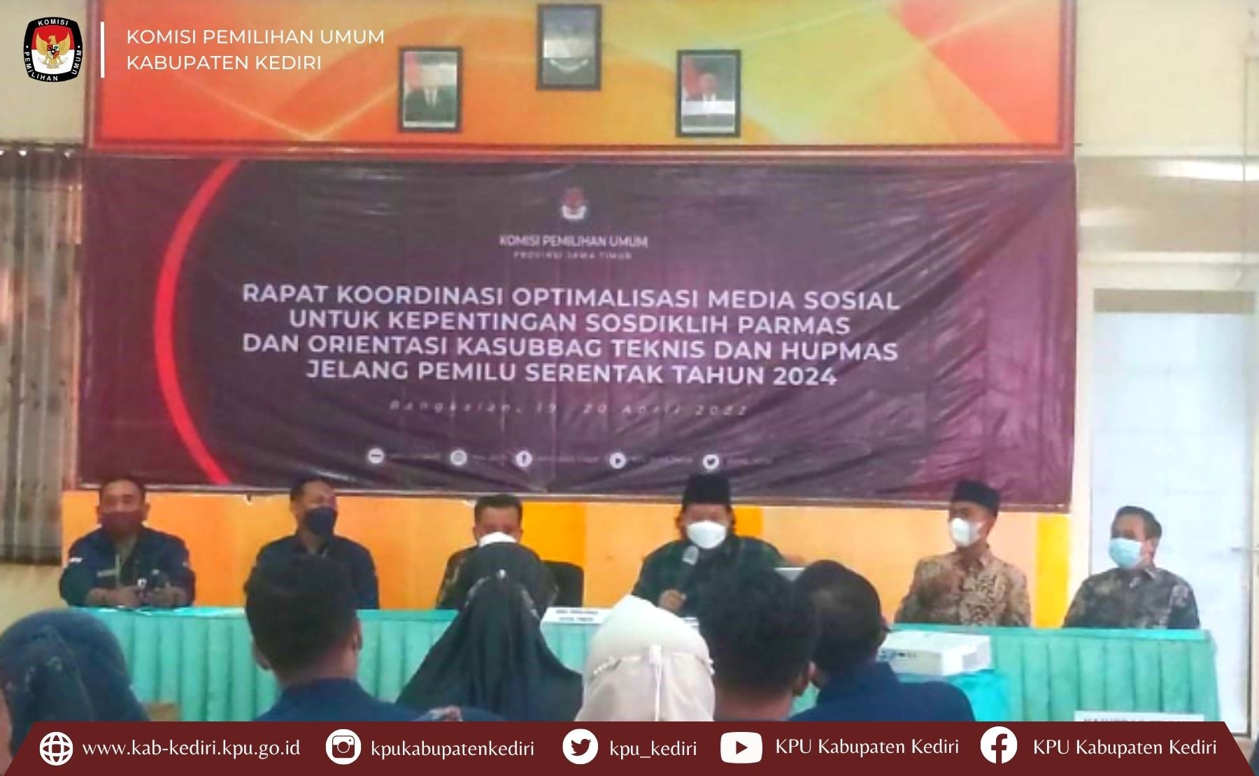 Bangkalan, kab-kediri.kpu.go.id - Dalam lanjutan Rapat Koordinasi Optimalisasi Media Sosial Untuk Kepentingan Sosdiklih Parmas dan Orientasi Kasubag Teknis dan Hupmas Jelang Pemilu Serentak Tahun 2024 yang digelar oleh KPU Provinsi Jatim. (Selasa - Rabu, 19 – 20 April 2022).