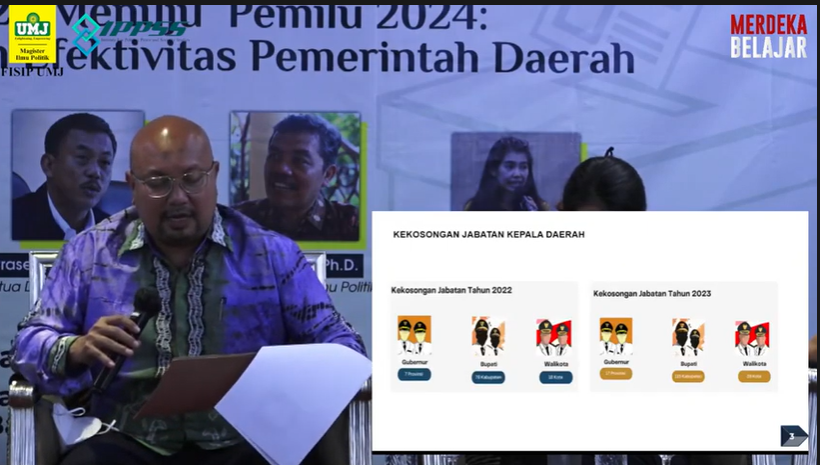 Dalam kesempatan kali ini menghadirkan narasumber dari Ketua KPU RI Ilham Saputra Kasubdit Wilayah IV Dit. FDKH dan DPRD Kemendagri L. Saydiman Marto, Anggota DPD RI Fahira Idris, Dosen Magister Ilmu Politik UMJ Sri Yunanto, yang dipandu oleh Direktur IPPSS Angel Damayanti sebagai moderator, serta dibuka oleh Kepala Prodi Mipol Fisip UMJ Asep Setiawan.