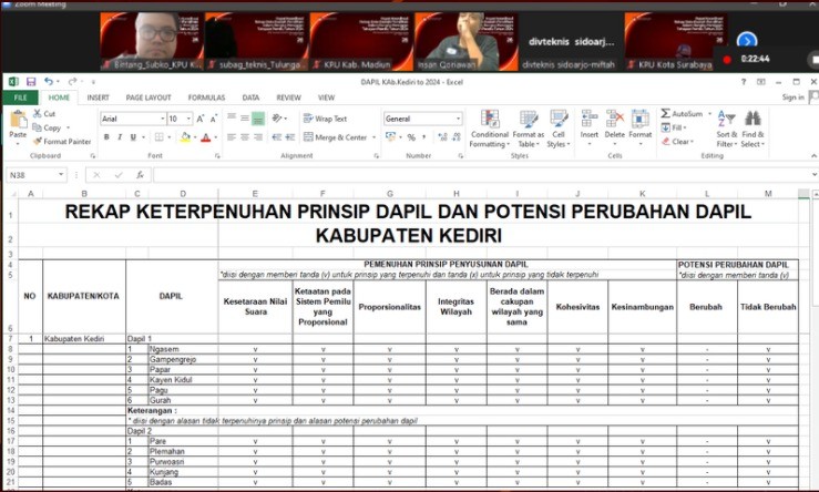 Kediri, kab-kediri.kpu.go.id - Rabu (26/01/2022) Komisi Pemilihan Umum (KPU) Kabupaten Kediri bersama dengan 38 KPU Kabupaten/Kota se-Jatim mengikuti Rapat Koordinasi Rekap Data Daerah Pemilihan (dapil) dalam Rangka Persiapan Tahapan 2024 secara virtual yang diadakan KPU Provinsi Jatim. Acara yang dimulai pukul 10.00 WIB ini dibuka dengan sambutan Ketua KPU Jatim, Choirul Anam yang menyampaikan dengan ditetapkannya hari pemungutan suara Pemilu 2024 di 14 Februari 2024, maka seluruh KPU Provinsi dan KPU Kabupaten/Kota harus memulai mempersiapkan diri. “Tentunya persiapan ini diawali dengan penataan dapil di tingkat KPU Kabupaten/Kota, dimana dalam penataan dapil ini haruslah sesuai dengan prinsip-prinsip penataannya,” tutur Anam. Berikutnya, Divisi SDM dan Litbang KPU Jatim, Rochani mengungkapkan bahwa rakor ini merupakan momen strategis untuk KPU Kabupaten/Kota melakukan penelitian terhadap dapil yang ada di wilayahnya. “Apakah dapil di wilayah teman-teman sudah memenuhi syarat atau perlu adanya perubahan. Dan perlu diperhatikan juga hal-hal force majeure untuk dapat didahulukan yang ada pada dapil,” ungkapnya. Sementara itu, Divisi Perencanaan dan Logistik KPU Jatim Miftahur Rozaq meskipun rentan waktu tahapan masih jauh namun harus dipersiapkan, terkait dengan divisi teknis KPU Jatim membutuhkan koordinasi terkait komponen pencalonan perseorangan. “Divisi Perencanaan akan melakukan rakor terkait koordinasi dengan divisi teknis meliputi harga satuan template-template, sehingga teman-teman teknis juga perlu mencermati rancangan RKB. Karena seiring telah ditetapkannya hari pemungutan suara Pemilu 2024 dimungkinkan adanya revisi pada DIPA,” kata Rozaq. Menambahkan arahan komisioner, Sekretaris KPU Jatim, Nanik Karsini menuturkan penataan SDM di KPU Jatim akan selesai di akhir bulan, Paling lambat 30 Januari 2022 kekosongan kasubag di KPU Kabupaten/Kota akan segera terisi. “Penataan ini dimaksudkan agar SDM yang ditunjuk dapat segera beradaptasi sehingga mampu memaksimalkan kinerja menjelang Pemilu 2024,” ucap Nanik. Memasuki acara utama, menurut Divisi Teknis Penyelenggaraan, Insan Qoriawan dalam penataan dapil perlu adanya prinsip dalam menyertakan peran publik hal ini akan berdampak terhadap anggota DPR/ DPRD yang sedang exist saat ini. “Peran publik dalam pendapilan tidak bisa diabaikan Mengapa demikian? karena publik dapat mengajak mereka (anggota DPR/ DPRD) dan memberikan masukan, baik akademisi, LSM, ormas maupun parpol terkait dengan zona pertarungan mereka yang krusial. Meskipun nanti setelah mendapatkan masukan ternyata dapil tersebut tidak berubah,” ucap Insan. Insan menambahkan hasil pendapilan ini tidak hanya ranah pada divisi Teknis namun perlu dibicarakan bersama dan ditetapkan dalam pleno berdasarkan semua pihak dan dalam pencermatan jangan hanya terpaku dengan jumlah penduduk saja, namun memperhatikan dengan hal-hal lain. Pada kesempatan itu, Divisi Teknis Penyelenggaraan KPU Kabupaten Kediri, Anwar Ansori ditunjuk menjelaskan proses pendapilan di Kabupaten Kediri. Anwar menyampaikan terkait perubahan data kependudukan di Kabupaten Kediri dan hasil analisa terkait harga kursi di Kabupaten Kediri tiap dapil masih setara jika mengacu 10% antara 90 sampai 100 % sudah terpenuhi. “Dari 6 Dapil di Kediri paling kecil 6 Kursi dan paling besar 10 kursi. Kesetaraan kursi antar dapil sudah setara,” ungkap Anwar. Anwar juga mengungkapkan Integralitas dari Kabupaten Kediri tidak ada wilayah yang terpisah, kohesivitas pun tidak ada kesenjangan di masing-masing wilayah di Kabupaten Kediri serta prinsip kesinambungan data dari Pemilu 2019 hingga data terakhir yang digunakan masih relevan dan ideal untuk persiapan Pemilu Tahun 2024.