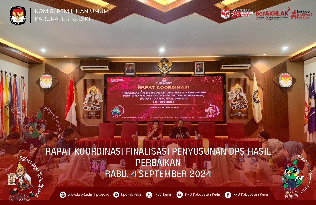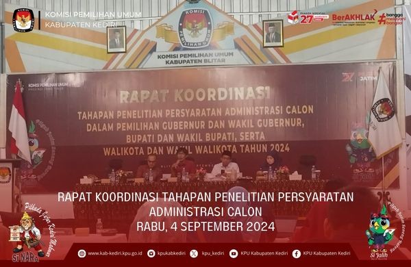 Kediri, kab-kediri.kpu.go.id - Rabu (4/9), KPU Kabupaten Kediri menggelar Rakor Finalisasi Penyusunan Daftar Pemilih Sementara Hasil Perbaikan (DPSHP) dalam Pemilihan Gubernur dan Wakil Gubernur Jawa Timur serta Pemilihan Bupati dan Wakil Bupati Kediri Tahun 2024. Bertempat di Aula KPU Kabupaten Kediri acara dimulai tepat pukul 15.00 WIB. Hadir dalam acara tersebut Divisi Perencanaan Data dan Informasi Moh. Isnaini, Divisi Sosdikli Parmas dan SDM Eka Septiawan Feydyanto dengan mengundang PPK PIC Data se-Kabupaten Kediri Mewakili Ketua KPU Kabupaten Kediri Eka Septiawan memberi sambutan dalam acara ini. Dalam sambutannya Eka menyampaikan bahwa sangat penting mengawal hak suara masyarakat maka dari itu dalam penyusunan daftar pemilih harus sangat teliti dan harus dipastikan. "Teman-teman dalam menyusun daftar pemilih harus teliti, karena kita harus memastikan setiap warga memperoleh haknya untuk memberikan suaranya," ujar Eka. Acara dilanjutkan ke acara inti dengan penyampaian dari Divisi Perencanaan Data dan Informasi Moh Isnanini. Beliau menyampaikan bahwa tujuan dilaksanakan rakor ini adalah untuk memastikan data sebelum dilaksanakannya rapat pleno terbuka. Lebih lanjut Isnaini isnaini menyampaikan dalam pelaksanaan rapat pleno terbuka harus menggunakan proyektor karena itu merupakan salah satu bentuk transaparasi data. Selain itu setiap momen harus dilakukan dokumentasi sehingga ada bukti jika dibelakang terjadi suatu hal. "Saya harap teman-teman dapat menginformasikan kepada PPS dalam melaksanakan rapat pleno DPSHP harus menggunakan proyektor agar semua peserta dapat melihat angka dan prosesnya," ujar Isnaini. "Setiap momen dalam pelaksanaan rapat pleno juga harus di dokumentasikan, sebagai bukti otentik jika kemudian hari dipertanyakan,"lanjutnya.(and)
