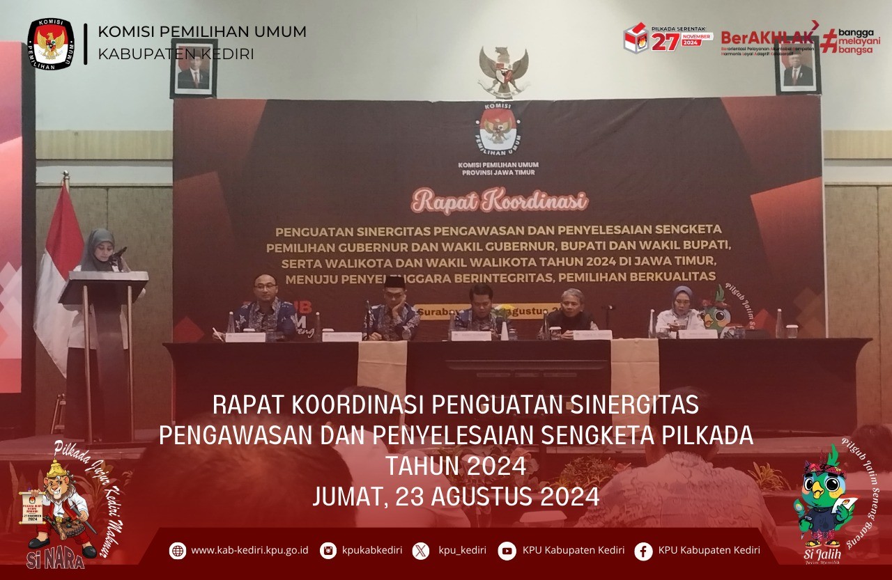 Kediri, kab-kediri.kpu.go.id - KPU Kabupaten Kediri mengikuti Rapat Koordinasi penguatan sinergitas pengawasan dan penyelesaian sengketa pemilihan Gubernur dan Wakil Gubernur, Bupati dan Wakil Bupati serta Walikota dan Wakil Walikota Tahun 2024 di Jawa Timur, menuju penyelenggara berintegritas, pemilihan berkualitas. Rakor dilaksanakan di Novotel Samator Surabaya, Jl. Raya Kedung Baruk No.26-28, Kedung Baruk, Kec. Rungkut, Surabaya selama 2 hari, hari kamis-Jumat tanggal 22-23 Agustus 2024. Rakor pada kesempatan ini mengundang 114 peserta KPU se Kab/Kota se Jawa Timur terdiri dari Ketua, Divisi Hukum dan Pengawasan serta Kasubag Tekmas Partisipasi, dan Hubungan Masyarakat KPU Kabupaten/Kota Se-Jawa Timur. Turut hadir mewakili KPU Kabupaten Kediri, Ketua Nanang Qosim, Ketua Divisi Hukum dan Pengawasan Moh. Dziyaudin dan Kasubag Tekmas Donny Hendrawan. Aang Kunaifi, Ketua KPU Jatim dalam sambutan sekaligus membuka acara menyampaikan, sesama penyelenggara pemilu harus solid karena permasalahan sejatinya bukan karena penyelenggaranya akan tetapi bisa faktor-faktor dari luar. “Kita harus sikapi bersama, duduk bersama menyamakan persepsi, saling koordinasi sesama penyelenggara, apabila sesama penyelenggara terjadi permasalahan selesaikan dan temukan jalan keluar bersama-sama”, kata Aang. “Yang penting kita sudah melaksanakan regulasinya, sesuai jalur dan tracknya. Karena regulator dari KPU RI dan Bawaslu RI, kita hanya melaksanakan, dimana sifatnya itu hierarki”, imbuhnya. Aang menambahkan, sejatinya prinsipnya dan kerja-kerja untuk mewujudkan pemilu itu sesuai asas penyelenggara pemilu dan sesuai undang-undang serta aturan yang ada dan jangan menyimpang dari reguliasi tersebut. “Setidaknya ada komunikasi antara sesama penyelenggara, KPU dan Bawaslu dan juga pada tahapan Pencalonan besuk perlu diingatkan kepada peserta pemilu, parpol pengusul terkait ketua dan sekretaris DPC/ tingkat Kabupaten Kota untuk mengantarkan pasangan bakal calon untuk mendaftar sebagai kepala daerah”, kata Aang. Eka Wisnu Wardhana, Anggota Divisi SDM dan Litbang, dalam arahannya menyampaikan sebagai penyelenggara pemilu sampai sekarang, kami merasa sangat sinergis, sangat dekat dan dinamis. Salah satunya adalah bisa bersinergi, menyamakan pemahaman, ada PKPU, ada juga Perbawaslu. “Persepsi, ya kita samakan persepsi dengan sesama penyelenggara misal ada Surat Edaran, ada Surat Dinas, ada juga Petunjuk Teknis, kita memahami bersama, dari KPU dengan Bawaslu agar terjadilah kedinamisan itu”, ucap Wisnu. “Satu sama lain saling menguatkan, tahapan sama ketika Bawaslu tahapan pencalonan untuk pengawasan, KPU melaksanakan pencalonan itu sendiri”, imbuh Komisioner berkacamata itu. Habib M. Rohan, Anggota KPU Jatim Divisi Hukum dan Pengawasan dalam arahannya menyampaikan dalam rapat koordinasi ini agar teman-teman mampu memitigasikan setiap tahapan-tahapan pilkada serentak ini, mampu memberikan pencegahan agar penyelenggaranya berintegritas dan menjadi hasil pilkada yang berkualitas. “Hal ini kalau bisa sinergikan dan cocokkan, kami meyakini pilkada ini berjalan aman, lancar dan kondusif”, kata Rohan. “KPU dan Bawaslu adalah serangkaian yang sama, sinergi kebersamaan kita, saling memahami kita, akan tetapi kami mohon agar jangan terlena, jangan sampai menyepelekan disetiap tahapan, jangan menabrak atura-aturan yang telah ada”, katanya.(don)