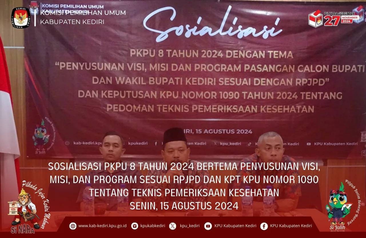 Kediri, kab-kediri.kpu.go.id - Kamis (15/8) KPU Kabupaten Kediri menggelar Sosialisasi PKPU 8 Tahun 2024 dengan tema "Penyusunan Visi, Misi, dan Program sesuai RPJPD" dan Keputusan KPU Nomor 1090 tahun 2024 tentang Pedoman Teknis Pemeriksaan Kesehatan. Bertempat di Amaze Hotel acara dimulai pukul 10.00 WIB dengan menghadirkan 3 narasumber yaitu Kepala BAPPEDA Dr. Ir. H. Moch. Saleh Udin, MM., Kepala Dinkes dr. Ahmad Khotib, dan Koordiv Penanganan Pelanggaran Bawaslu M. Hamdaani, serta mengundang perwakilan partai politik yang memiliki kursi di DPRD. Mewakili Ketua, Anggota KPU Moh. Dziyaudin dalam sambutannya menyampaikan bahwa sosialisasi tersebut dilaksanakan sebagai penyampaian RPJPD kepada partai politik yang akan mengusung calon bupati dan wakilnya. "Bahwa dalam ketentuan pasal 13 ayat 1 (d) pasangan calon wajib menyampaikan kepada masyarakat secara lisan maupun tulisan berkaitan dengan visi misi program yang disusun berdasarkan RPJPD," ucapnya. Selain itu, acara ini juga bertujuan untuk memberikan informasi kepada seluruh parpol yang akan mengusul pasangan calon (paslon) pada Pilkada 2024, supaya mengetahui dengan persis mekanisme atau tata cara yang diatur dalam PKPU maupun juknis 1090 terkait dengan proses pemeriksaan kesehatan. “Pemeriksaan kesehatan ini nantinya ada 20 item, dimana sesuai juknis 1090, 18 item terkait pemeriksaan jasmani dan rohani, dan 2 item lainnya terkait pemeriksaan narkotika,” tutupnya.(don)