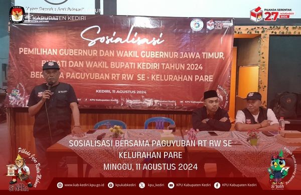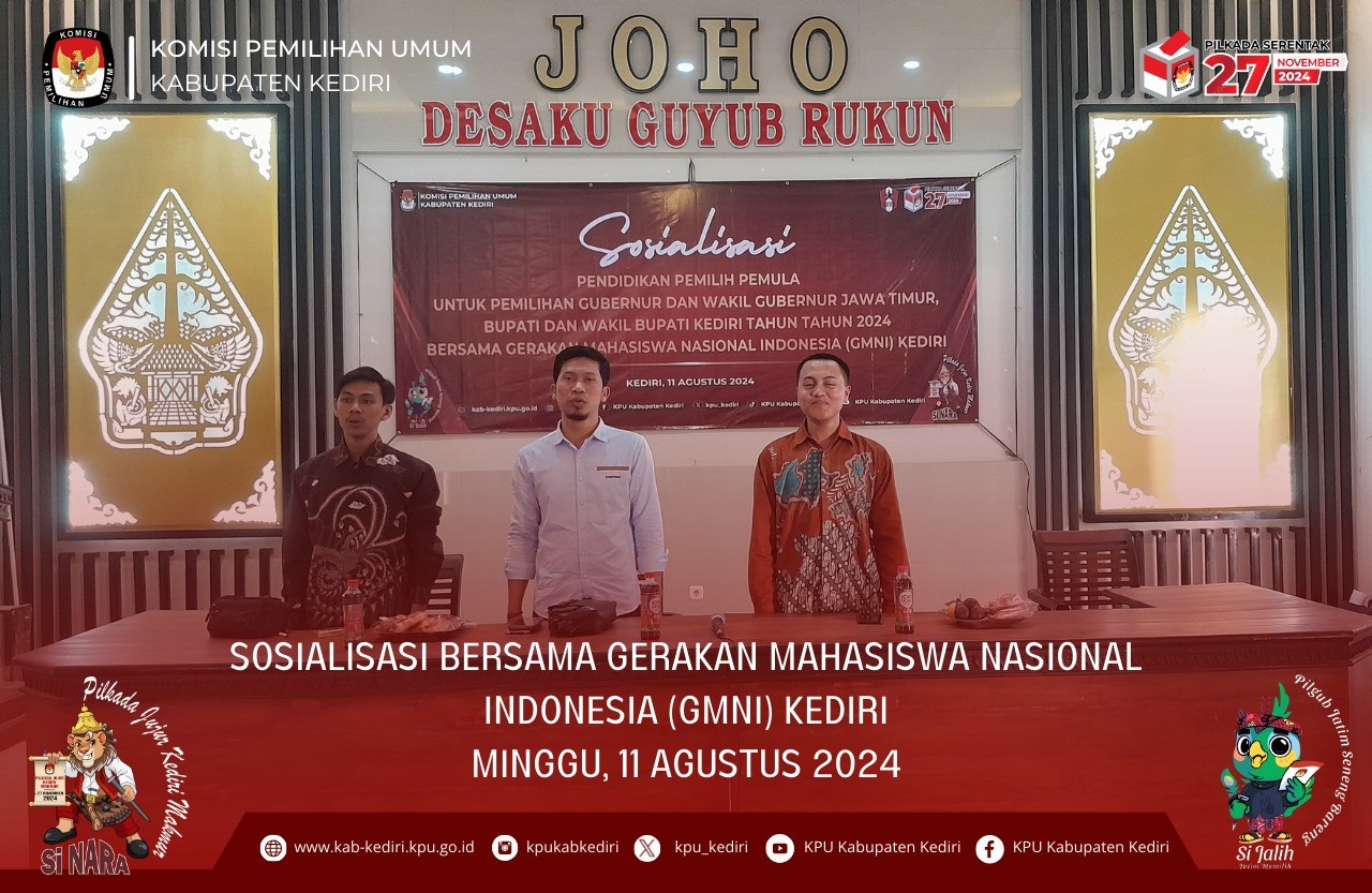 Kediri, kab-kediri.kpu.go.id - Minggu (11/8) Anggota KPU Kabupaten Kediri Divisi Perencanaan, Data dan Informasi, Moh. Isnaini didapuk menjadi narasumber dalam acara Sosialisasi Pilkada Serentak 2024 bersama Gerakan Mahasiswa Nasional Indonesia (GMNI) Kediri. Bertempat di Balai Desa Joho Kecamatan Wates. Sosialisasi dimulai pada pukul 15.00 WIB dengan dihadiri sekitar 100 peserta. Sebagai pembuka sosialisasinya Isnaini menyampaikan bahwa pada tanggal 27 November 2024 Provinsi Jawa Timur dan Kabupaten Kediri akan punya gawe yaitu Pemilihan Gubernur dan Wakil Gubernur juga Bupati dan Wakil Bupati. Maka dari itu Isnaini mengajak seluruh peserta untuk menyalurkan hak pilihnya. "Teman-teman, di tanggal 27 November nanti kita akan ada pemilihan Gubernur dan juga Bupati," Ujar Isnaini. "Sebagai Mahasiswa dan juga kader organisasi alangkah baiknya untuk berpartisipasi pada gelaran pesta demokrasi ini, minimal sebagai pemilih untuk menyalurkan suaranya," imbuhnya. Lebih lanjut Isnaini juga menjelaskan bahwa KPU berusaha untuk memfasilitasi hak suara dari setiap masayarakat. Tidak hanya yang berdomisili di Kabupaten Kediri, juga warga Jawa Timur khususnya akan dipastikan untuk dapat menggunakan hak pilihnya pada pilkada serentak Tahun 2024. "Kami sebagai KPU wajib memfasilitasi hak suara bagi warga Jawa Timur yang telah memiliki hak suara yaitu yang pertama dengan melakukan coklit dan terakhir kemarin kita sudah menetapkan Daftar Pemilih Sementara (DPS), ujar Isnaini. "Tidak sampai disitu kami masih akan memastikan warga yang sekarang belum berusia 17 tahun tapi nanti di hari pencoblosan sudah berusia 17 tahun juga harus kita fasilitasi, dan juga penyusunan daftar pemilih masih akan berlanjut hingga nanti di tetapkan sebagai Daftar Pemilih Tetap (DPT)," tutup Isnaini. Tidak hanya melakukan sosialisasi, pada kesempatan kali ini KPU Kabupaten Kediri juga membagikan pernak-pernik pemilu dan juga flayer ajakan untuk ikut memilih dalam Pilkada serentak Tahun 2024.(and)