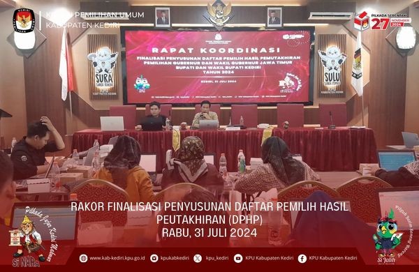 Kediri, kab-kediri.kpu.go.id - Rabu (31/7), KPU Kabupaten Kediri menggelar Rakor Finalisasi Penyusunan Daftar Pemilih Hasil Pemutakhiran (DPHP) dalam Pemilihan Gubernur dan Wakil Gubernur Jawa Timur serta Pemilihan Bupati dan Wakil Bupati Kediri Tahun 2024. Bertempat di Aula KPU Kabupaten Kediri acara dimulai tepat pukul 19.00 WIB. Hadir dalam acara tersebut Divisi Perencanaan Data dan Informasi Moh. Isnaini dengan mengundang PPK PIC Data se-Kabupaten Kediri Langsung masuk pada acara inti Isnaini menyampaikan bahwa hasil dari rakor di Tuban adalah Kabupaten Kediri tidak ada penambahan TPS. Tapi masih dimungkinkan adanya TPS lokasi khusus. "Hasil rakor kami di Tuban salah satunya adalah di Kabupaten Kediri tidak ada penambahan TPS normal, namun akan ada TPS Lokasi Khusus," ujar Isnaini. Terkait TPS lokasi khusus ketentuannya adalah jika dibuat di Lembaga Permasyarakatan minimal harus ada 200 pemilih, sedangan di lembaga pendidikan/pondok pesantren harus memiliki data 300 pemilih seheingga memenuhi syarat untuk di fasilitasi TPS Lokasi Khusus. "Untuk TPS lokasi khusus di Pondok Pesantren karena wilayah Kabupaten Kediri tidak ada lapas, maka minimal untuk dapat dibuat TPS Lokasi Khusus harus ada 300 pemilih," terang Isnanini. "Sementar ini hasil dari rakor kita bersama perwakilan Pondok Pesantren hanya ada satu yang bersedia dan memenuhi syarat untuk di fasilitasi TPS Lokasi Khusus yaitu Pondok Pesantren Al-Falah di Kecamatan Mojo," imbuhnya. Selanjutnya Isnaini juga membahas terkait himbauan dari Bawaslu terkait perubahan status dari TNI/Polri. Mengenai hal tersebut, Kecamatan yang terdapat data himbauan tersebut untuk segera menindaklanjuti dengan melakukan verifikasi kepada pemilih yang bersangkutan. "Untuk himbauan dari Bawaslu terkait perubahan status TNI/Polri, teman-teman segera lakukan verifikasi data tersebut," tegas Isnaini.(and)