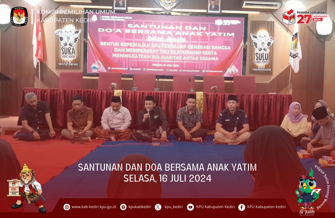 Kediri, kab-kediri.kpu.go.id - Selasa (16/7) Di Bulan Muharram kali ini KPU Kabupaten Kediri menggelar santunan anak yatim dan doa bersama dalam rangka bentuk kepedulian terhadap generasi bangsa dan mempererat tali silaturahmi serta meningkatkan solidaritas antar sesama. Bertempat di ruang Aula KPU Kabupaten Kediri, acara dimulai pukul 16.00 WIB dihadiri oleh Ketua KPU Kabupaten Kediri Nanang Qosim, Divisi Sosdiklih Parmas dan SDM Eka Septiawan Ferydyanto, Divisi Teknis Penyelenggaraan Irbabul Lubab, Divisi Perencanaan Data dan Informasi Moh. Isnaini, Divisi Hukum dan Pengawasan Moh. Dziyaudin dan Sekretaris Randy Agatha Sakaira. Acara dibuka oleh Nanang Qosim selaku Ketua KPU Kabupaten Kediri yang mengungkapkan rasa syukurnya telah dapat menggelar santunan dan doa bersama anak yatim pada hari ini. "Alhamdulillah sore ini kita dapat menggelar doa bersama dan santunan anak yatim, dan acara ini juga diselenggarakan serentak seluruh Indonesia di jajaran KPU," ungkapnya Acara dilanjutkan dengan do'a bersama yang dipimpin oleh Anggota Divisi Hukum dan Pengawasan Moh. Dziyaudin. Selepas do'a bersama Dziyaudin sedikit memberikan tausiyah singkat. Dalam tausyiahnya beliau menyampaikan untuk senantiasa mendoakan orang tua karena salah satu amalan yang tidak terputus adalah do'a dari anak-anak sholeh. "Jangan lupa untuk selalu mendoakan orang tua kita, salah satu amalan yang tidak terputus adalah do'a dari anak sholeh, dan semoga adik-adik sekalian kelak menjadi orang yang berguna bagi nusa dan bangsa," ujar Dziya. Sebanyak 30 anak yatim ikut hadir dalam acara do'a bersama. Acara hari ini sekaligus sebagai ajang do'a bersama demi kelancaran Pemilihan Gubernur dan Wakil Gubernur Jawa Timur serta Pemilihan Bupati dan Wakil Bupati Kediri Tahun 2024.(and)