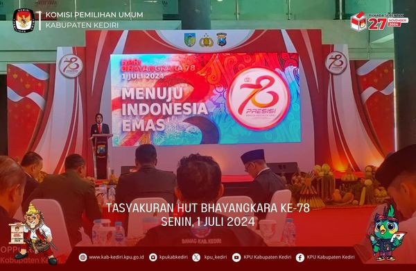 Kediri, kab-kediri.kpu.go.id - KPU Kabupaten Kediri menghadiri Tasyakuran Hari Bhayangkara ke-78. Bertempat di Convention Hall, acara dimulai pukul 10.00 WIB sampai dengan selesai. Hadir dalam kegiatan, Kapolres Kediri AKBP Bimo Ariyanto, S.H., S.I.K., bersama Wakapolres Kediri, jajaran Forkopimda Kabupaten Kediri, serta perwakilan media, toda, toga dan todat meramaikan acara ini. Turut Hadir Mewakili KPU Kabupaten Kediri adalah Nanang Qosim selaku Ketua KPU Kabupaten Kediri Memberikan sambutan, Kapolres mengatakan, selain untuk memperingati Hari Bhayangkara, tasyakuran ini menjadi ajang untuk mempererat hubungan antar anggota Polres Kediri dan pihak terkait dalam meningkatkan semangat kebersamaan. “Kita perkuat ikatan dan pastikan bahwa setiap anggota merasa dihargai dan termotivasi untuk bekerja lebih baik,” ungkapnya. Pada kesempatan tersebut, Polres Kediri juga menyalurkan bantuan sosial (bansos) kepada para penyandang difabel dan santunan anak yatim. “Polres Kediri selalu hadir dan membantu masyarakat, terutama mereka yang lebih memerlukan dukungan,” kata Kapolres. Kapolres menutup acara dengan menyampaikan harapannya agar Polres Kediri dapat terus berinovasi dan berkomitmen dalam melayani masyarakat. “Kita harus terus maju dan berkembang, menjaga kepercayaan masyarakat kepada Polri. Mari kita bekerja bersama-sama wujudkan Polri yang Presisi,” tuturnya.(and)