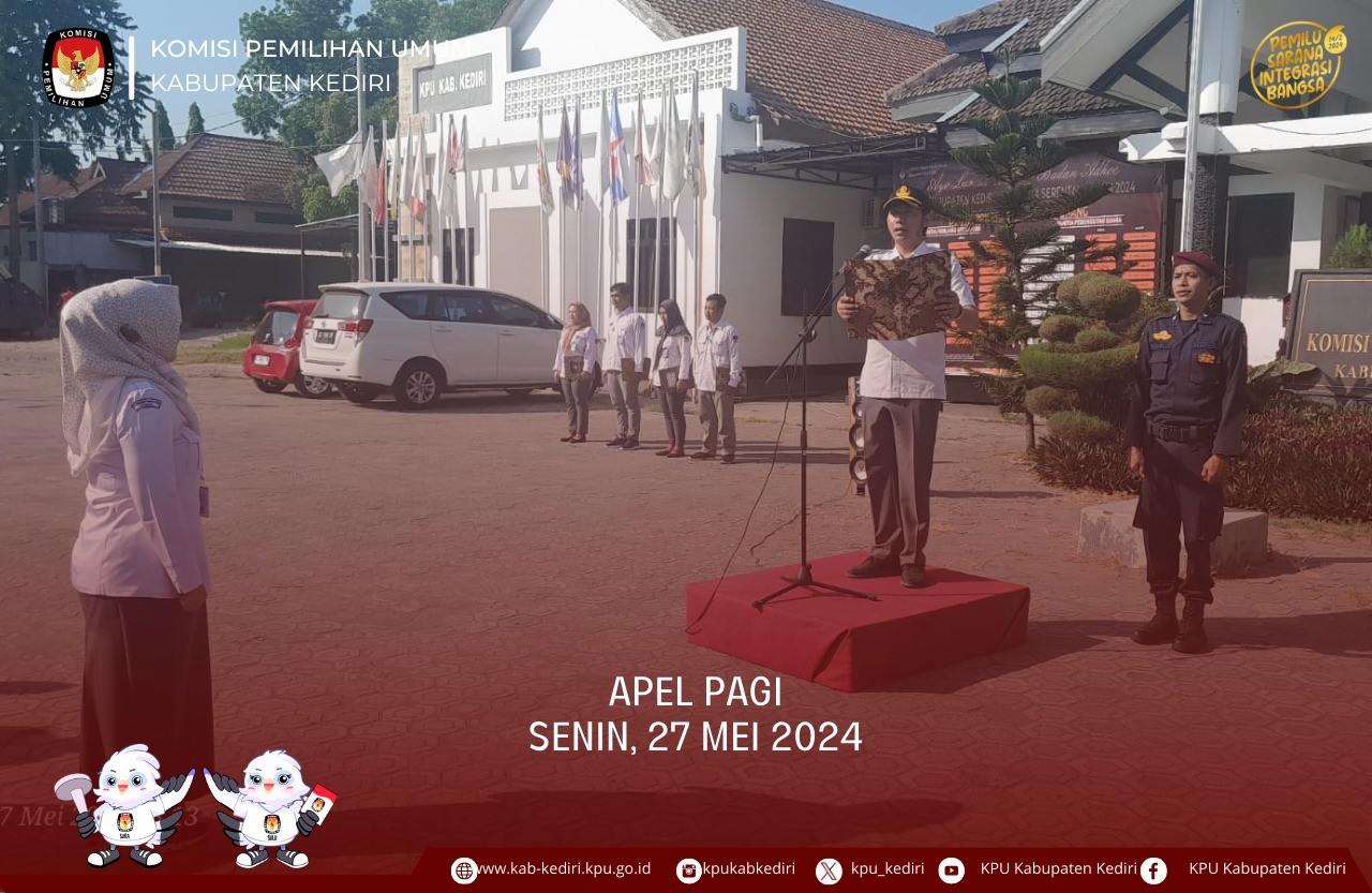 Kediri, kab-kediri.kpu.go.id - Senin (27/5), KPU Kabupaten Kediri menggelar Apel Pagi rutin setiap hari Senin yang diikuti oleh seluruh Komisioner dan jajaran sekretariat KPU Kabupaten Kediri. Berlangsung mulai pukul 08.00 WIB sampai dengan selesai. Sesuai dengan teks susunan apel berjalan dengan lancar. Diawali dengan laporan kepada pembina apel dan dilanjut dengan penghormatan kepada bendera merah putih, kemudian mengheningkan cipta untuk mengenang jasa-jasa pahlawan bangsa Indonesia. Bertindak sebagai pembina Apel, Randy Agatha Sakaira, selaku Sekretaris KPU Kabupaten Kediri menyampaikan apresiasi atas terlaksananya pembentukan badan adhoc mulai PPK hingga PPS yang berjalan dengan lancar. Hal ini tak lepas dari kerjasama dari seluruh pihak jajaran KPU Kabupaten Kediri. Randy juga berharap untuk kedepan kerjasama seperti ini akan terus terjalin dengan baik. "Tahapan pembentukan badan adhoc PPK dan PPS telah terselenggara dengan baik, hal ini tidak lepas dari kerja keras dan kerjasama dari kawan-kawan semua, saya harap kerjasama seperti ini terus berlanjut pada tahapan-tahapan berikutnya," ujar Randy. Sebagai penutup amanatnya tidak lupa Randy juga berpesan untuk senantiasa menjaga semangat, menjaga kesehatan baik fisik dan mental. "Semakin dekat dengan pelaksaan Pilkada 2024 tentunya tahapan dan kegiatan akan semakin padat, maka dari itu teman-teman harus menjaga semangat dan kesehatannya untuk dapat melaksanakan tugas dengan sebaik-baiknya" tutup Randy.(and)