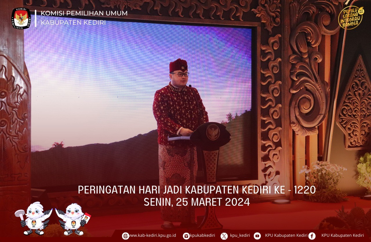Kediri, kab-kediri.kpu.go.id - Senin (25/3) Ketua KPU Kabupaten Kediri, Ninik Sunarmi menghadiri peringatan Hari Jadi Kabupaten Kediri ke - 1220 dengan mengusung tema Kediri Parartha Jayati yang mengandung arti Kediri sejahtera dan mulia. Sebagaimana isi dalam Prasasti Harinjing diceritakan bagaimana Bhagawanta Bari melakukan inovasi dengan membangun sudetan atau percabangan Sungai Harinjing. Selain mengatasi banjir, pembuatan sudetan itu juga dimanfaatkan untuk pertanian. Apa yang menjadi harapan Bupati Kediri itu selaras dengan potensi yang dimiliki Kabupaten Kediri terutama sektor pertanian. Bahkan, kabupaten berjuluk Bumi Panjalu ini menjadi salah satu daerah penghasil sayuran tertinggi di Jawa Timur. Dalam kesempatan itu, Mas Dhito juga berharap pembangunan yang ada maupun tengah berjalan di Kabupaten Kediri segera terwujud. Seperti bandara yang tinggal menunggu beroperasi, pembangunan jalan tol serta pembangunan stadion. Tak kalah penting, Mas Dhito berpesan kepada masyarakat Kediri untuk tetap menjunjung tinggi etika dan budaya toleransi. Meski wilayahnya terpisah sungai Brantas, Mas Dhito menekankan warga Kabupaten Kediri harus tetap bersatu padu dalam satu kesatuan. "Saya minta semuanya menjadi satu kesatuan yaitu Kabupaten Kediri, jadi nggak ada warga Barat, nggak ada warga Timur adanya warga Kabupaten Kediri," pungkasnya.(and)