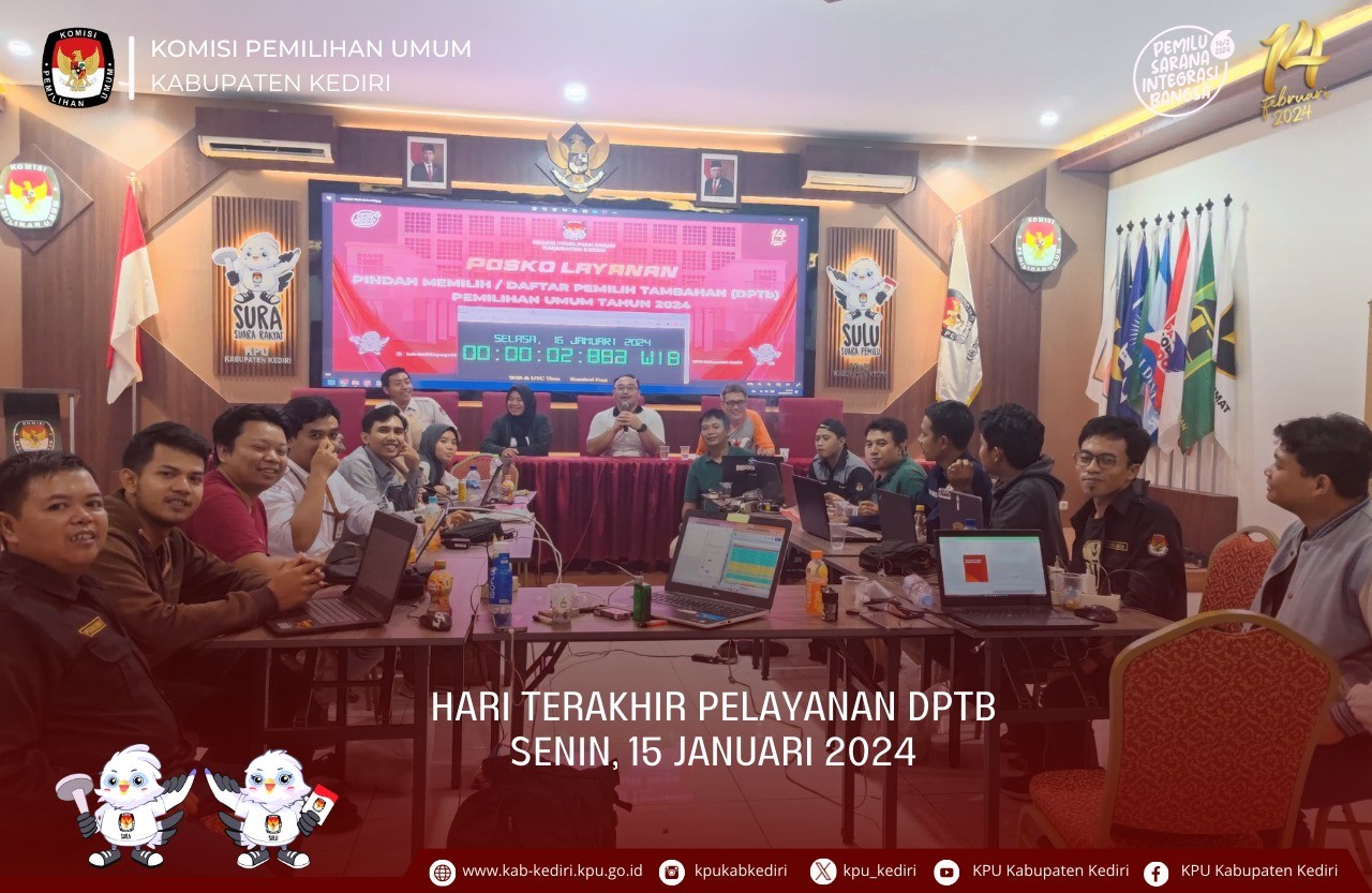 Kediri, kab-kediri.kpu.go.id - Senin (15/1), Hari terakhir pelayanan pindah pilih/DPTb, KPU Kabupaten Kediri dalam hal ini membuka posko layanan hingga pukul 23.59 WIB. Ditemui ditengah proses pelayanan DPTb, Eka Wisnu Wardhana selaku Anggota DIvisi Perencanaan Data dan Informasi sekaligus yang mengkomandoi terkait data pemilih mengatakan bahwa pihaknya telah menyiapkan beberapa mekanisme dalam memfasilitasi masyarakat terkait proses pindah pilih ini, termasuk menyediakan beberapa TPS Khusus di Kabupaten Kediri. “Kita juga menggiatkan sosialisasi, publikasi, informasi dalam kaitannya dengan TPS Khusus ini. Lalu kita juga memberikan pelayanan prima bagi pemilih yang akan melakukan pindah pilih," terang Wisnu. Wisnu juga menyampaikan bahwa bahwa dalam pelayanan pindah pilih ini seluruh jarjaran mulai PPK dan PPS juga disiagakan. " Hari ini tanggal 15 Januari kita buka pelayanan sampai jam 23.59 WIB. Dan kami juga menyiagakan seluruh pasukan kami mulai dari KPU Kabupaten, PPK dan PPS di Kecamatan se-Kabupaten Kediri untuk standby di posko guna melayani masyarakat yang akan mengajukan pindah pilih,” ucap Wisnu. Wisnu juga menyampaikan bahwa pindah pilih terakhir tanggal 15 Januari ini terkhusus pada 5 kategori dari total 9 kategori yang ada, meliputi penyandang disabilitas yang dirawat di panti sosial atau panti rehabilitasi, menjalani rehabilitasi narkoba, tugas belajar/menempuh pendidikan menengah atau tinggi, dan pindah domisili. "Untuk kategori kategori bertugas ditempat lain saat hari pemungutan suara, menjalani rawat inap, tertimpa bencana, dan menjadi tahanan rutan atau lapas, bisa melakukan pengurusan proses pindah pilih sampai dengan H-7 Pemilu 2024," tutr Wisnu.(and)