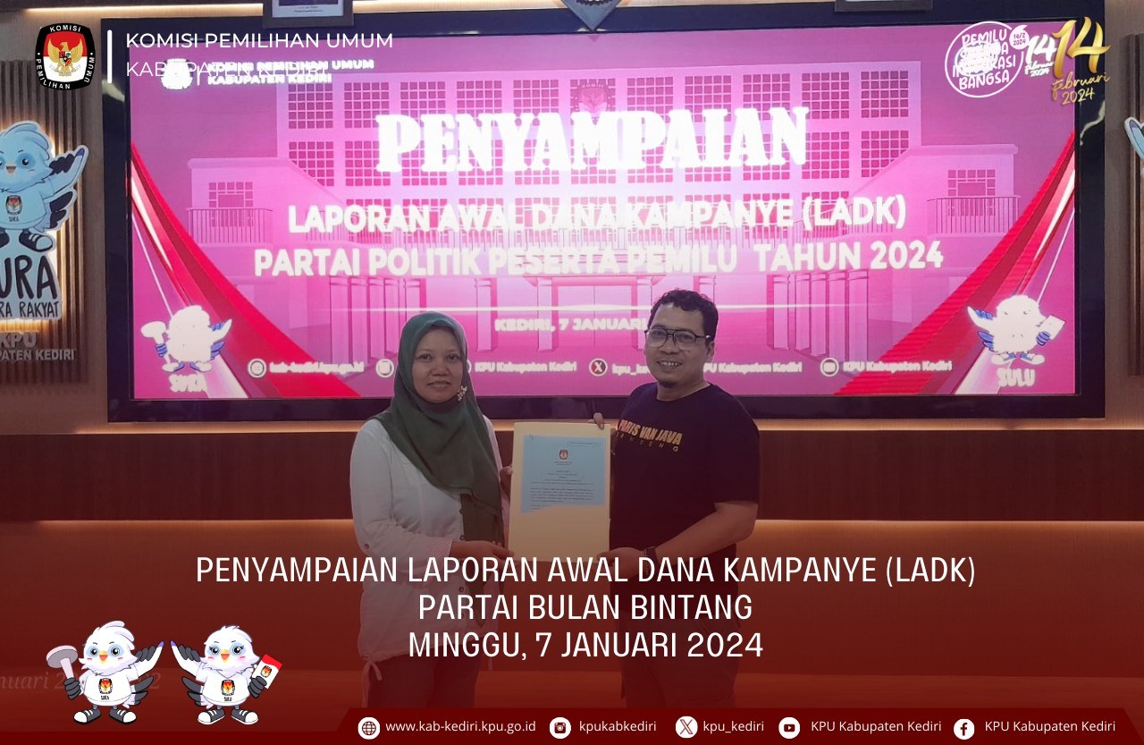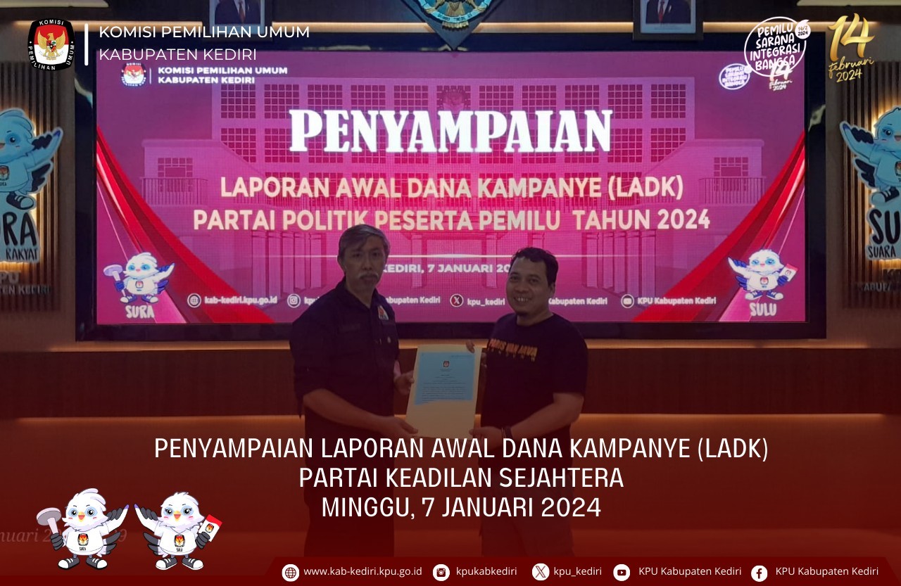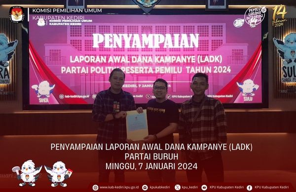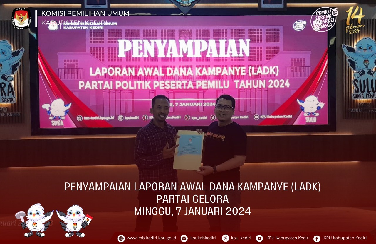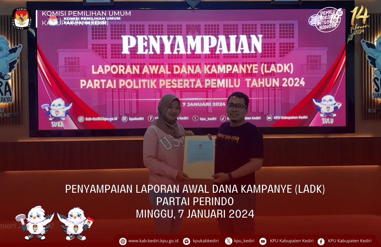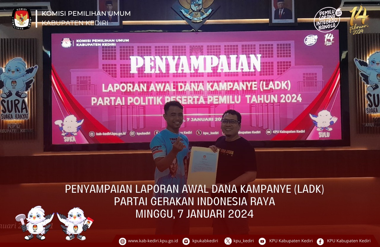 Kediri, kab-kediri.kpu.go.id - Minggu (7/1) Partai Gelombang Rakyat Indonesia menyerahkan Laporan Awal Dana Kampanye (LADK) ke Kantor KPU Kabupaten Kediri, Jl. Pamenang No.1, Ngasem, Kediri.