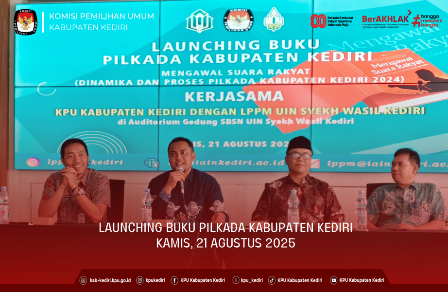 Kediri, kab-kediri.kpu.go.id - Kamis (21/8), Komisi Pemilihan Umum (KPU) Kabupaten Kediri meluncurkan dan membedah buku berjudul Mengawal Suara Rakyat yang merangkum perjalanan panjang penyelenggaraan Pilkada dari tahun 2024. Buku ini ditulis oleh jajaran KPU bersama tim akademisi LPPM UIN Syekh Wasil dan menghadirkan catatan penting mengenai dinamika regulasi, pengalaman lapangan, hingga tantangan yang dihadapi dalam menjaga kualitas demokrasi di daerah. Kehadiran buku ini diharapkan menjadi rujukan akademis sekaligus dokumentasi sejarah demokrasi lokal.
