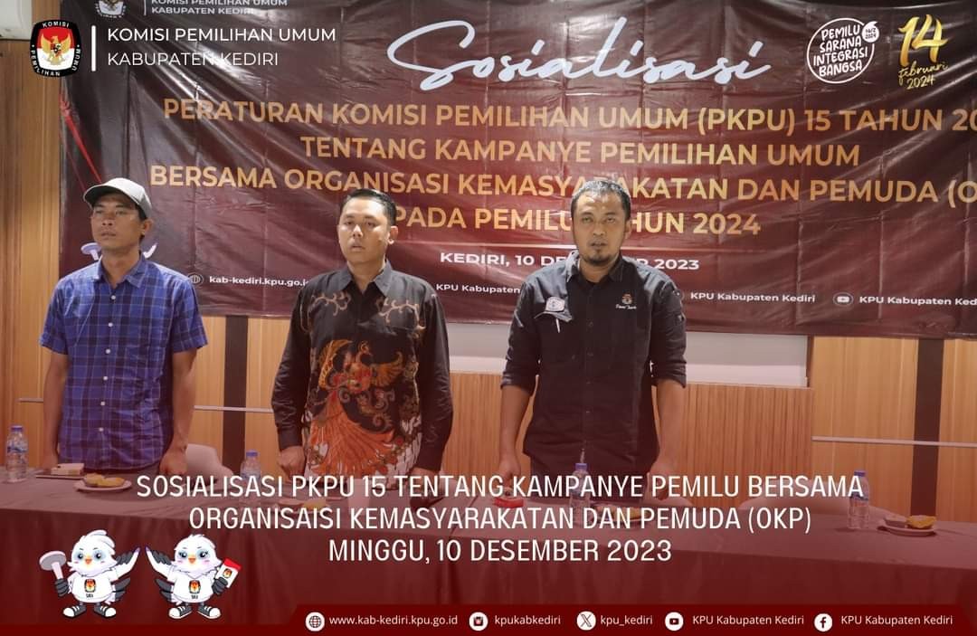Kediri, kab-kediri.kpu.go.id – Minggu (10/12) KPU Kabupaten Kediri menggelar Sosialisasi PKPU 25 tentang Kampanye Pemilu bersama Organisasi Kemasyarakatan dan Pemuda (OKP) Kabupaten Kediri. Digelar di Tempat Bercakap Kopi acara dimulai pada pukul 10.00 WIB dengan Ormas Pemuda Pancasila, GP anshor, IPNU, IPPNU, IMM, Nasiyatul Aisyiyah, PHDI, Pemuda Kristien, PaLM, PMII, HMI, GMNI, serta perwaikal BEM dari kampus di Kabupaten Kediri. Dibuka dengan sambutan dari Agus Hariono selaku Komisioner Divisi Hukum dan Pengawasan yang dalam hal ini mewakili Ketua KPU Kabupaten Kediri. Dalam sambutannya agus menyampaiakan bahwa pemilih muda memiliki komposisi yg besar dalam pemilu tahun 2024, sehinga banyak sekali peran yang dapat diambil pemuda untuk ikut mensukseskan Pemiu tahun 2024 "Banyak peran yang dapat diambil oleh pemuda dalam Pemilu kali ini, selain hanya sebagi pemilih para pemuda dapat mengambil peran sebagi penyelenggara ataupun pengawas," terang Agus Dalam acara ini juga menghadirkan dua narasumber yaitu Nanang Qosim Selaku Divisi Sosdiklih Parmas dan SDm serta Muhammad Haamdaani selaku Kordiv Penanganan Pelanggaran Bawaslu Kabupaten Kediri. Diawali dengan materi oleh Nanag Qosim, beliau menyampaikan terkait tahpan kampanye yang sedang berlangsung. Dalam hal ini Nanang mengajak para peserta ikut aktif dengan menyampaikan jiks terjadi pelanggaran dalam proses kampanye. "Saya berharap para pemuda yang hadir disini dapat berperan aktif untuk melaporkan jika terjadi pelanggaran kampanye, agar supaya kampanye yang dilakukan oleh para peserta pemilu dilaksanakan sesuai dengan peraturan yang berlaku," ungkap Nanang. Mempertegas penjelasan dari Nanang Qosim, Hamdaani selaku narasumber kedua juga menyampaikan bahwa laporan tersebut dapat disampaikan kepada Bawaslu. Selanjutnya Bawaslu akan melakukan Investigasi dan menetapka apakah hal tersebut masuk dalam pelanggaran kampanye atau tidak. Acara diakhiri dengan sesi tanya jawab. Para peserta sangat antusias dan memberikan pertanyaan seputar daftar pemilih kepada narasumber. (And)