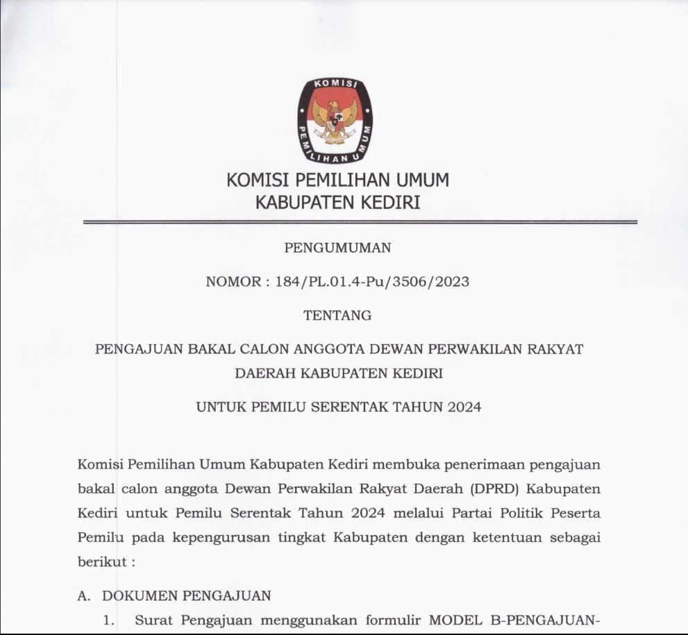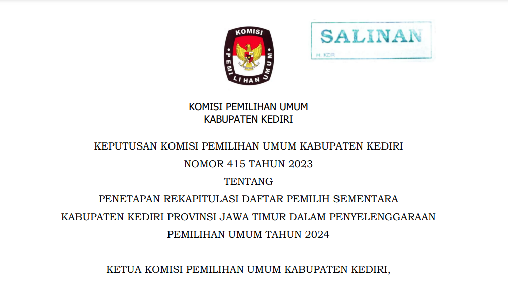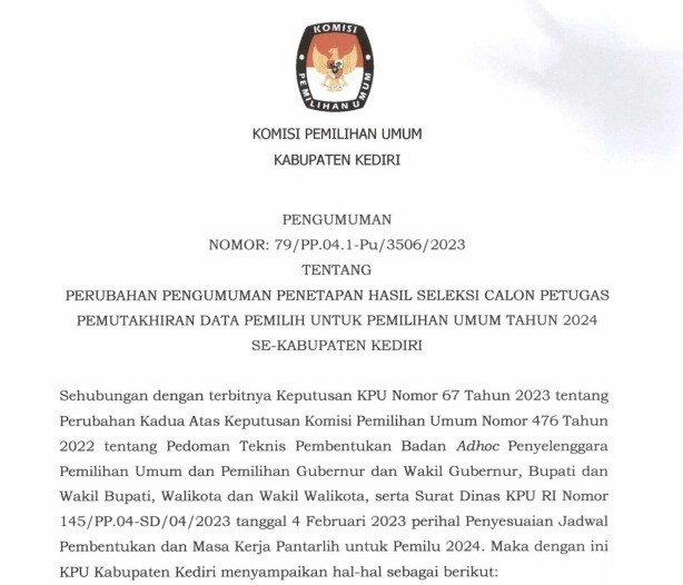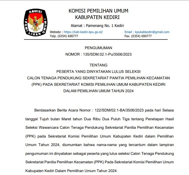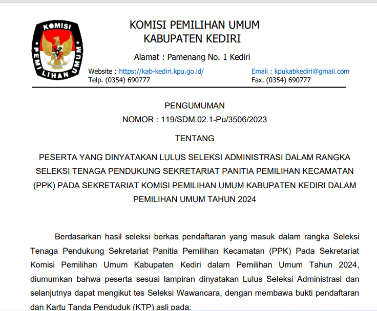 Kediri, kab-kediri.kpu.go.id - Berdasarkan hasil seleksi berkas pendaftaran yang masuk dalam rangka Seleksi Tenaga Pendukung Sekretariat Panitia Pemilihan Kecamatan (PPK) Pada Sekretariat Komisi Pemilihan Umum Kabupaten Kediri dalam Pemilihan Umum Tahun 2024, diumumkan bahwa peserta sesuai lampiran dinyatakan Lulus Seleksi Administrasi dan selanjutnya dapat mengikut tes Seleksi Wawancara, dengan membawa bukti pendaftaran dan Kartu Tanda Penduduk (KTP) asli pada: