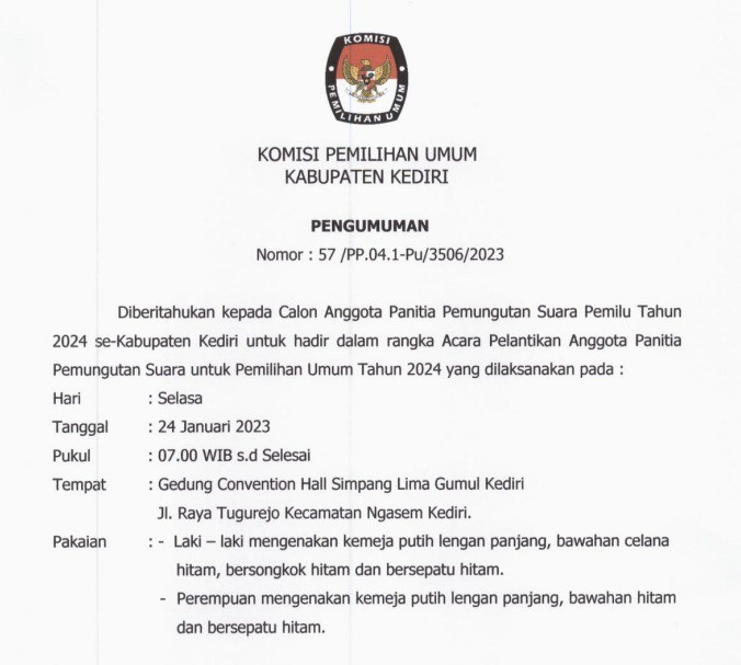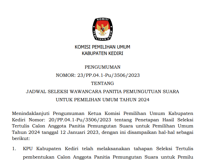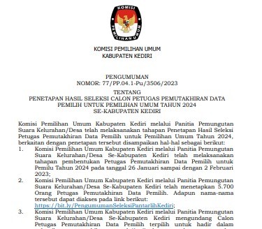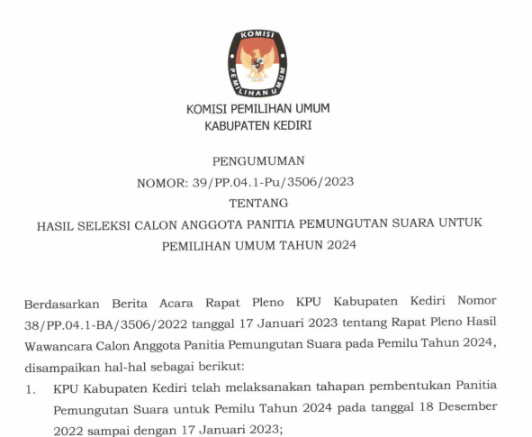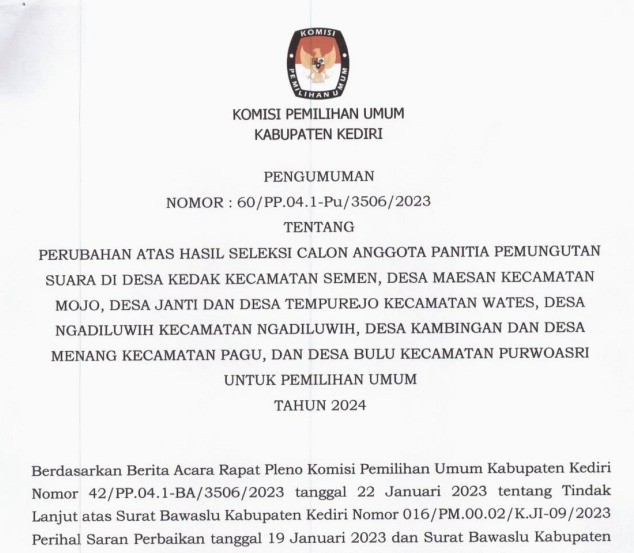 Kediri, kab-kediri.kpu.go.id - Berdasarkan Berita Acara Rapat Pleno Komisi Pemilihan Umum Kabupaten Kediri Nomor 33/PP.04.1-BA/3506/2023 tanggal 14 Januari 2023 tentang Perubahan Atas Hasil Seleksi Tertulis Calon Anggota Pemungutan Suara di Desa Puhrubuh Kecamatan Semen, Desa Kraton Kecamatan Mojo, Desa Brangggahan Kecamatan Ngadiluwih dan Desa Sonorejo Kecamatan Grogol, dengan ini disampaikan hal-hal sebagai berikut: