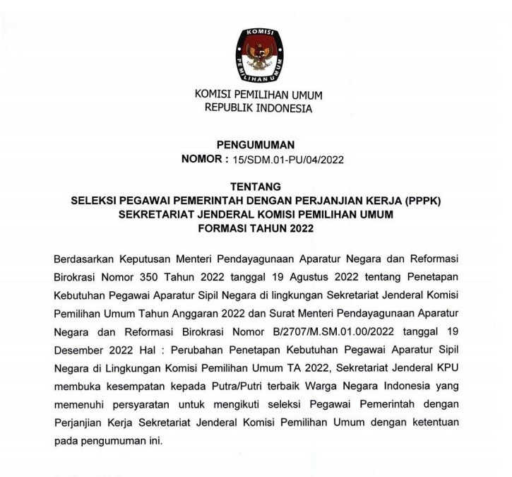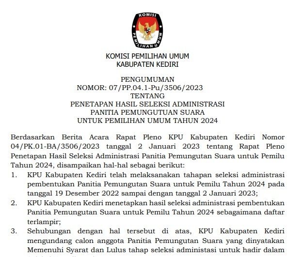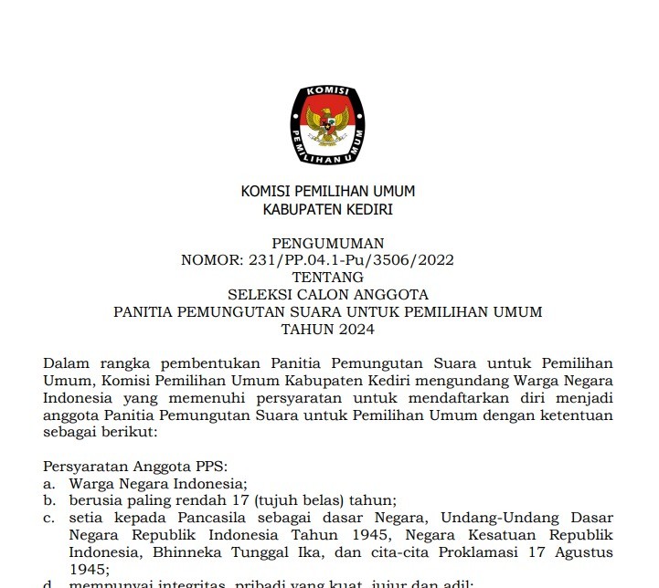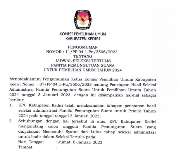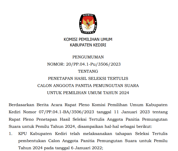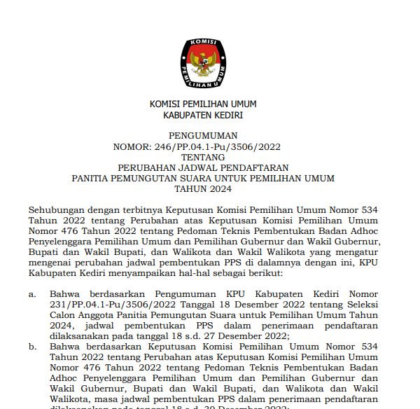 Kediri, kab-kediri.kpu.go.id - Sehubungan dengan terbitnya Keputusan Komisi Pemilihan Umum Nomor 534 Tahun 2022 tentang Perubahan atas Keputusan Komisi Pemilihan Umum Nomor 476 Tahun 2022 tentang Pedoman Teknis Pembentukan Badan Adhoc Penyelenggara Pemilihan Umum dan Pemilihan Gubernur dan Wakil Gubernur, Bupati dan Wakil Bupati, dan Walikota dan Wakil Walikota yang mengatur mengenai perubahan jadwal pembentukan PPS di dalamnya dengan ini, KPU Kabupaten Kediri menyampaikan hal-hal sebagai berikut: