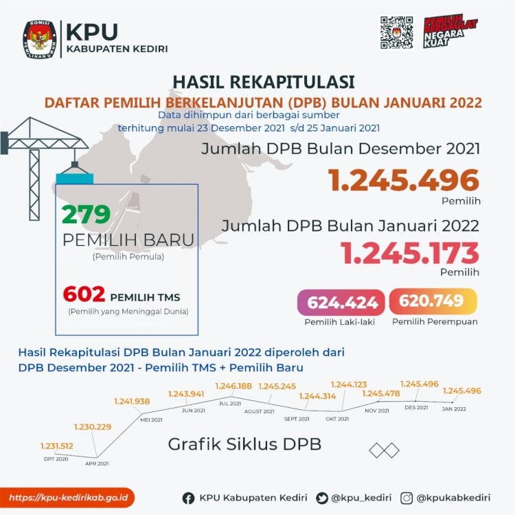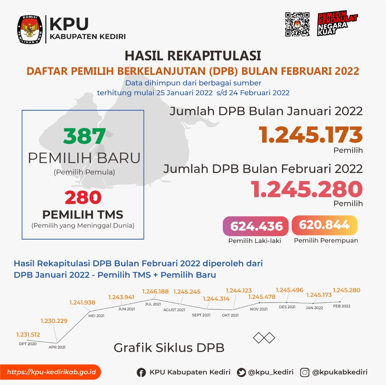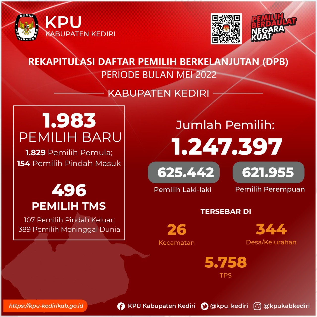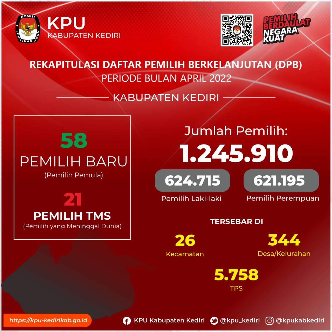 Kediri, kab-kediri.kpu.go.id - Jumat (22/04/2022) Bertempat di ruang Media Center, Komisi Pemilihan Umum (KPU) Kabupaten Kediri menggelar Rekapitulasi Hasil Pemutakhiran Daftar Pemilih berkelanjutan Periode Bulan April Tahun 2022. Proses rapat pleno Rekapitulasi DPB ini dilaksanakan sebagai tindak lanjut dari ketentuan PKPU Nomor 6 Tahun 2021 tentang Pemutakhiran Data Pemilih Berkelanjutan yang mana KPU Kabupaten /Kota diharuskan untuk melakukan pemutakhiran dan rekapitulasi Data Pemilih Berkelanjutan setiap bulannya. Salah satu sumber masukan Pemutakhiran Data Pemilih Berkelanjutan pada bulan April ini adalah Saran Perbaikan yang disampaikan oleh Bawaslu Kabupaten Kediri sebagaimana Surat Ketua Bawaslu Kabupaten Kediri nomor 020/PM.00.02/K.JI-09/04/2022 Perihal Saran Perbaikan yang mana dalam surat tersebut disampaikan sejumlah 89 Data yang terdiri dari 68 Data Penduduk yang belum genap berusia 17 tahun namun sudah menikah dan 21 Orang yang telah meninggal. Dari data yang disampaikan oleh Bawaslu kemudian KPU Kabupaten Kediri melakukan verifikasi dan validasi yang dibantu oleh dinas kependudukan dan pencatatan sipil kabupaten kediri. Hasil rekapitulasi PDPB Bulan April diperoleh Pemilih Baru yang berasal dari Pemilih Pemula sejumlah 58 Pemilih dan Pemilih TMS (Tidak Memenuhi Syarat) dengan kriteria Meninggal Dunia sejumlah 21 Pemilih sehingga diperoleh jumlah Pemilih pada PDPB Bulan April adalah jumlah pemilih sebanyak 1.245.910 pemilih dengan rincian pemilih laki-laki berjumlah 624.715 pemilih dan pemilih perempuan berjumlah 621.195 pemilih, tersebar di 26 Kecamatan, 344 Kelurahan/Desa dan 5758 TPS.