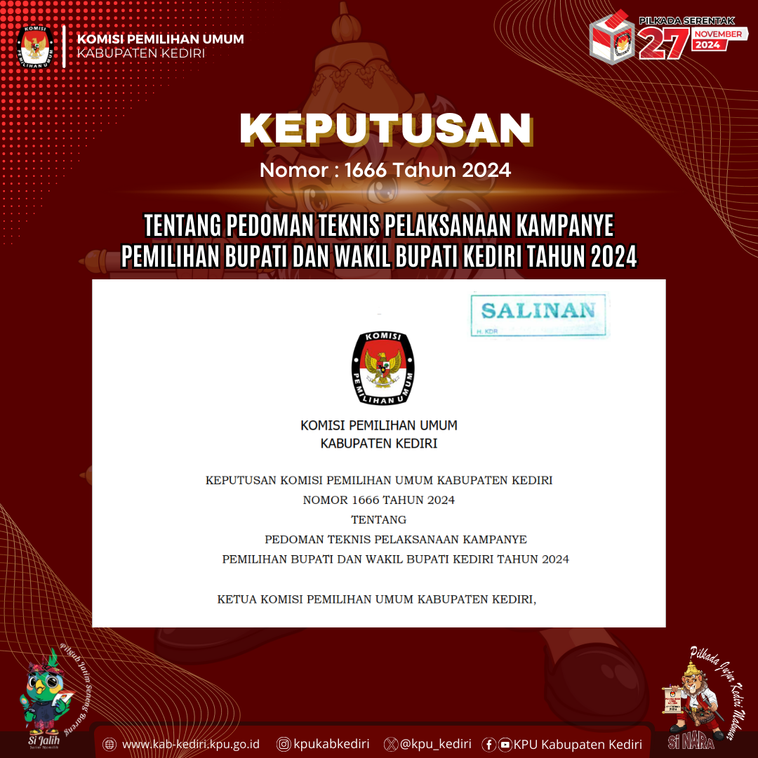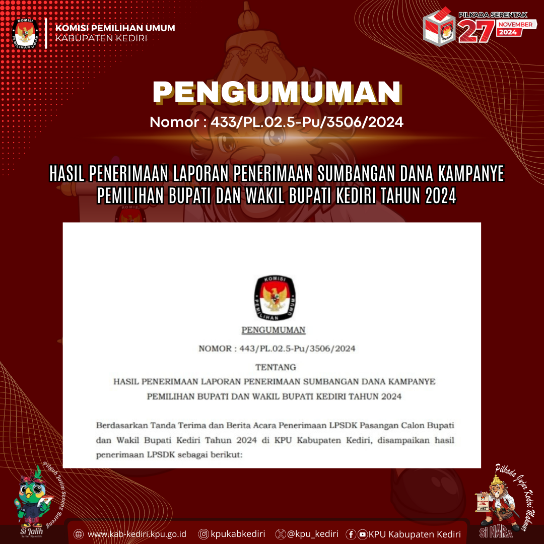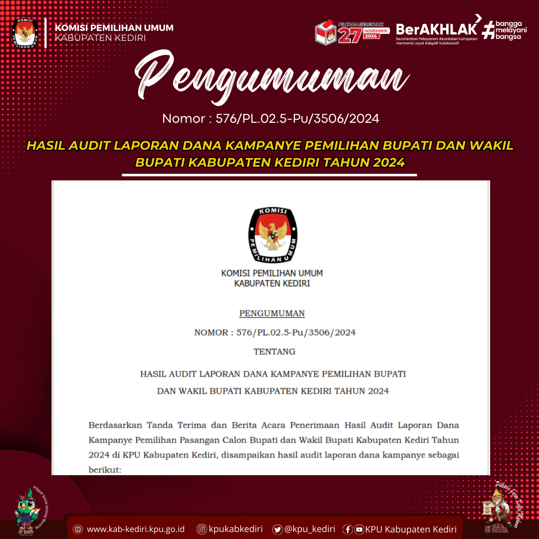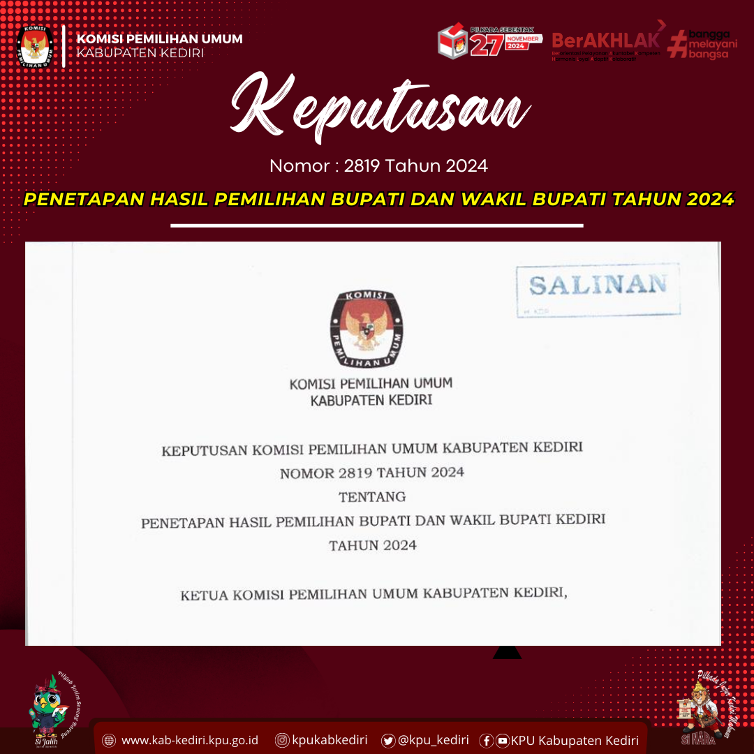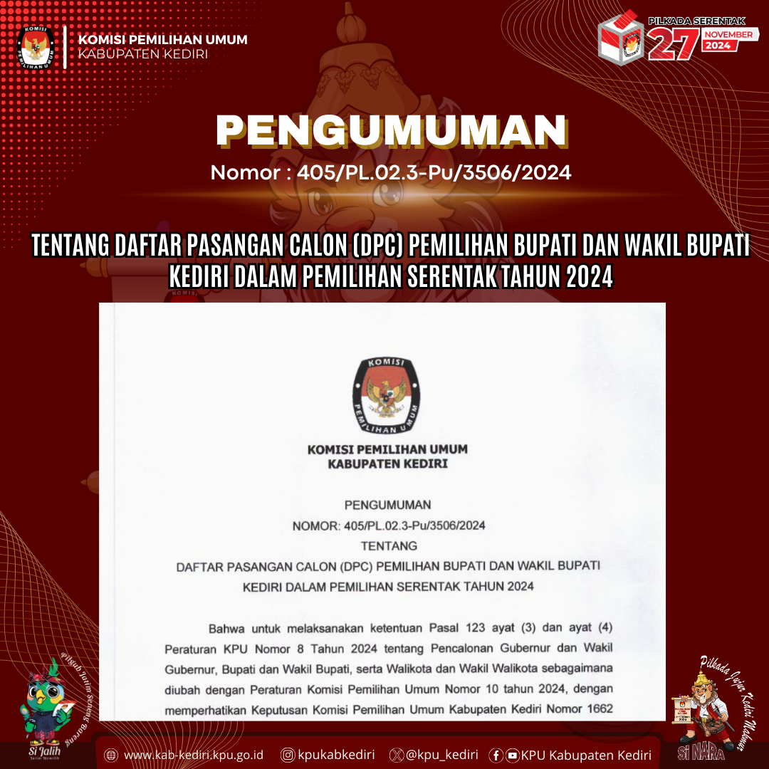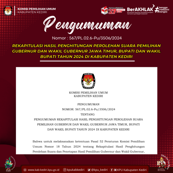 Bahwa untuk melaksanakan ketentuan Pasal 37 dan Pasal 55 Peraturan KPU Nomor 18 Tahun 2024 tentang Rekapitulasi Hasil Penghitungan Perolehan Suara dan Penetapan Hasil Pemilihan Gubernur dan Wakil Gubernur, Bupati dan Wakil Bupati, serta Walikota dan Wakil Walikota, dengan ini Komisi Pemilihan Umum Kabupaten Kediri mengumumkan: MODEL D.HASIL KABKO-KWK-Gubernur Rekapitulasi Hasil Penghitungan Perolehan Suara Pemilihan Gubernur dan Wakil Gubernur Jawa Timur Tahun 2024 tingkat KPU Kabupaten Kediri sebagaimana terlampir. MODEL D.HASIL KABKO-KWK-Bupati/Walikota Rekapitulasi Hasil Penghitungan Perolehan Suara Pemilihan Bupati dan Wakil Bupati Kediri Tahun 2024 tingkat KPU Kabupaten Kediri sebagaimana terlampir. Salinan Keputusan Komisi Pemilihan Umum Kabupaten Kediri Nomor: 2819 Tahun 2024 tentang Penetapan Hasil Pemilihan Bupati dan Wakil Bupati Kediri Tahun 2024 sebagaimana terlampir. Demikian diumumkan untuk diketahui. Selengkapnya bisa diunduh disini : Pengumuman DISINI D.HASIL KABKO-KWK-Gubernur DISINI D.HASIL KABKO-KWK-Bupati/Walikota DISINI Salinan Keputusan Komisi Pemilihan Umum Kabupaten Kediri Nomor: 2819 Tahun 2024 Tentang Penetapan Hasil Pemilihan Bupati dan Wakil Bupati Kediri Tahun 2024 DISINI